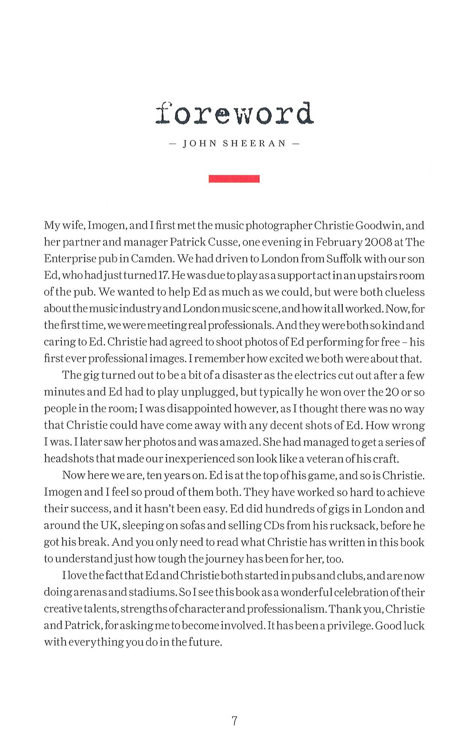 ...a fabulous book' Chris Evans (BBC Radio 2)A stunning collection of rare and unseen photographs and stories charting Ed Sheeran's rise to global superstar, by long-time collaborator Christie Goodwin.Featuring a foreword and additional photo captions by Ed's father, John Sheeran."When I first met Ed Sheeran he was unknown and unsigned - just a young busker trying to make it big. But I could see something special in Ed. I agreed to photograph him for free to help him on his way to the top. That was the beginning of a 10-year collaboration, with the two of us crossing paths as Ed became one of the biggest stars on the planet - a story told here, through my camera. Including images and stories I'm sharing for the first time, with additional captions by Ed's father John, this is an up-close and intimate view of Ed Sheeran."Christie Goodwin