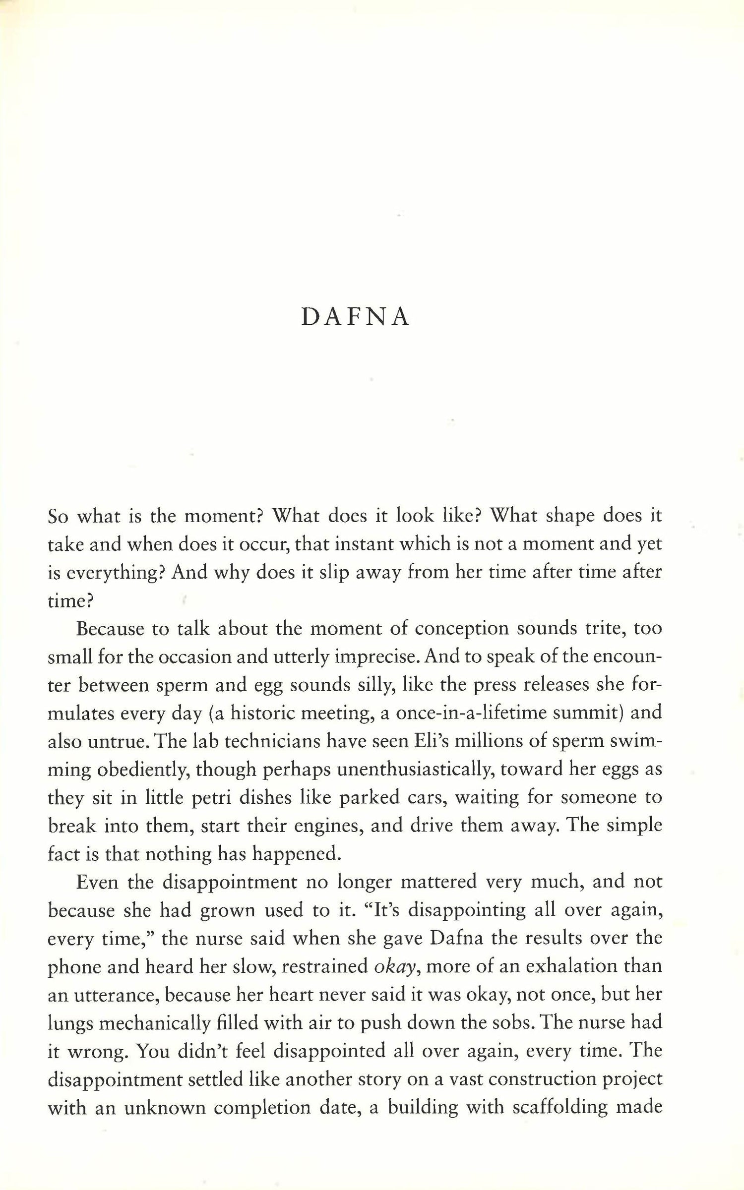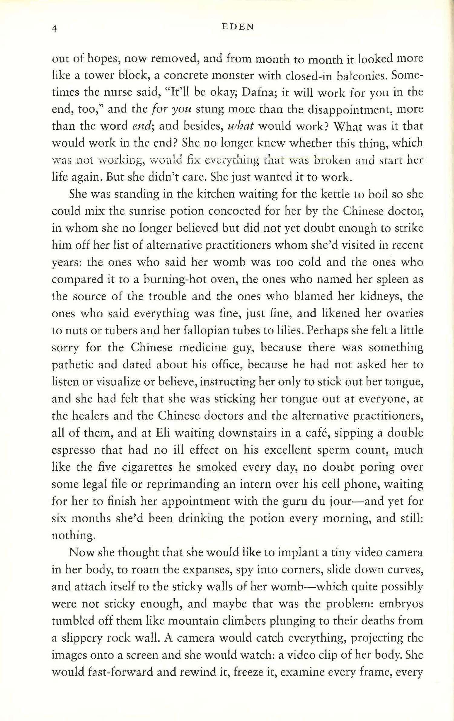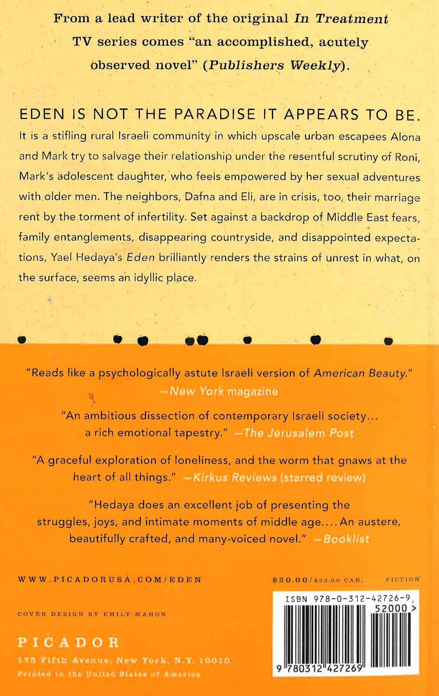 Eden is no paradise: it is the stifling, rural community in which upscale urban escapees, the separated Alona and Mark reunite under the resentful scrutiny of Roni, Mark's needy adolescent daughter. Against the rich panorama of Eden's oldtimers and newcomers, Roni's father and stepmother are jolted out of their own absorbing concerns and a new family structure begins to form out of an unlikely set of characters. Through a portrait of family entanglements, disappearing countryside, and disappointed expectations, Yael Hedaya, "does an excellent job of presenting the struggles, joys, and intimate moments of middle age through this austere, beautifully crafted, and many-voiced novel". ("Booklist").