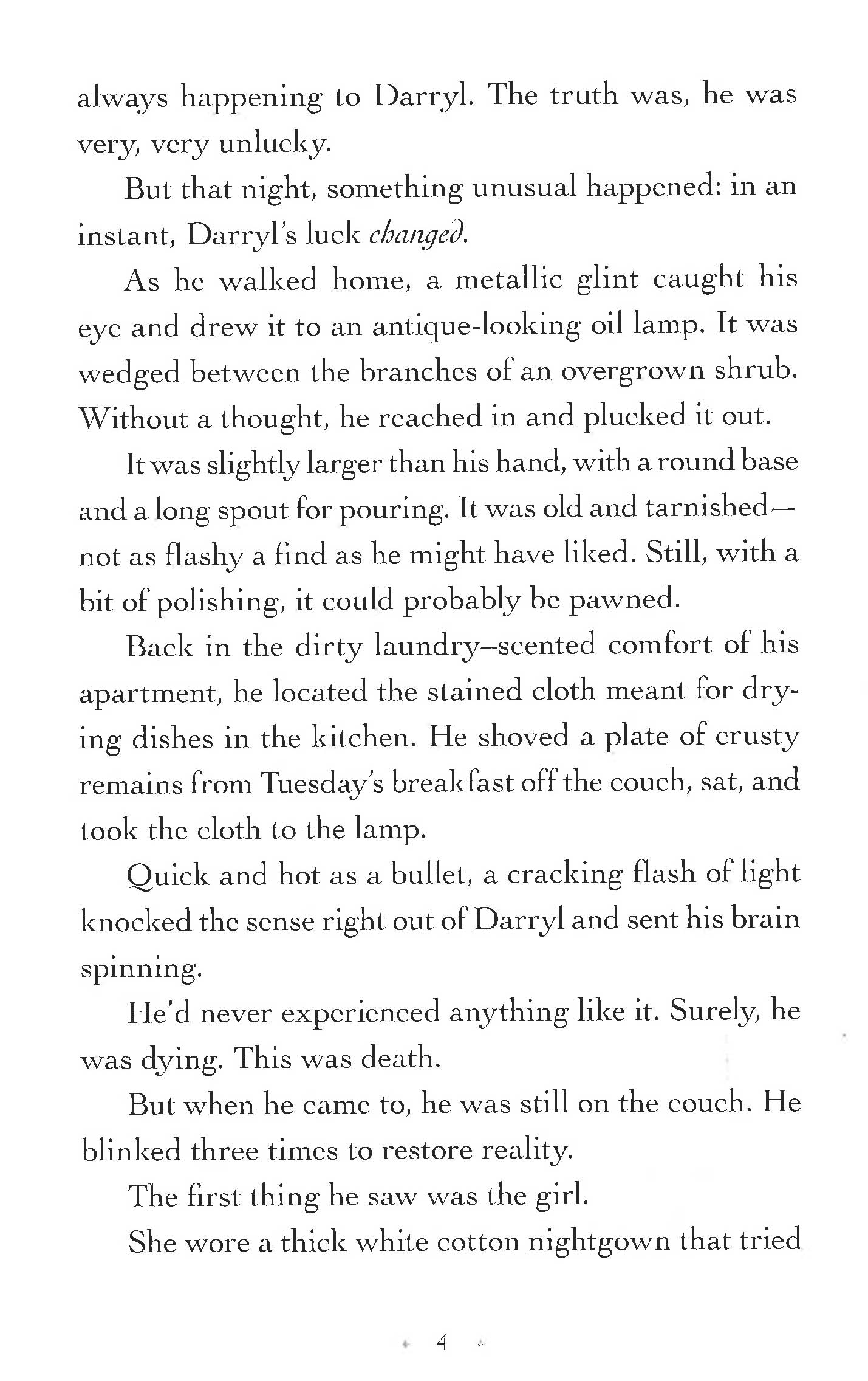 All twelve years of Eden's life have been spent in an antique oil lamp. She lives like a princess inside her tiny, luxurious home, but to Eden, the lamp is nothing but a prison. She hates being a genie. All she wants, more than anything, is freedom.When Eden finds a gateway to Earth inside the lamp, she takes her chance. In a moment, she's entered the world she loves. And this time, she won't be sent back after three wishes.Posing as the new kid at a California middle school, Eden revels in all of Earth's pleasures - but quickly learns that this world isn't as perfect as she always thought it was. Eden soon finds herself in the middle of a centuries-old conflict between powerful immortals. A ruthless organization run by a former genie will stop at nothing to acquire the lamp and its power-including hurting Tyler and Sasha, the mortal friends who have given Eden a home. To save her friends-and protect the magic of the lamp-Eden will have to decide once and for all where she belongs.