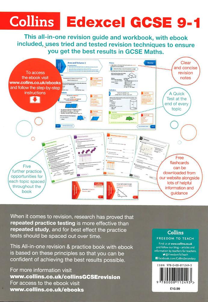 Revision that Sticks! Collins Edexcel GCSE 9-1 Maths Foundation Complete All-in-One Revision and Practice, uses a revision method that really works: repeated practice throughout. A revision guide, workbook and practice paper in one book! With clear and concise revision for every topic, plus seven practice opportunities, Collins offers the best revision at the best price. Includes: • quick tests as you go • end-of-topic practice questions • topic review questions later in the book • mixed practice questions at the end of the book • more topic-by-topic practice in the workbook • a complete exam-style paper • free Q&A flashcards to download online • an ebook version of the revision guide