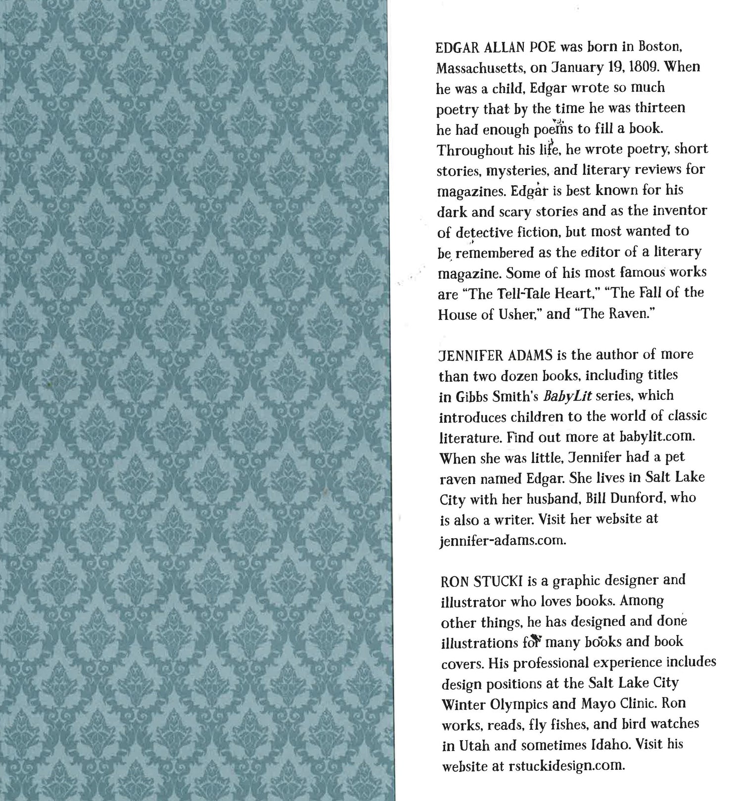 Meet the plucky toddler Edgar the Raven! He's mischievous, disobedient, and contrary. Dinnertime, cleanup-time, and bedtime are all met with one word: NEVERMORE! But as the evening winds to a close, Edgar's mom knows just what to do to get her son into bed--a bedtime story. Jennifer Adam's charming story gives a sly wink to Edgar Allan Poe's The Raven and will have little literature lovers saying, `MORE! MORE!`