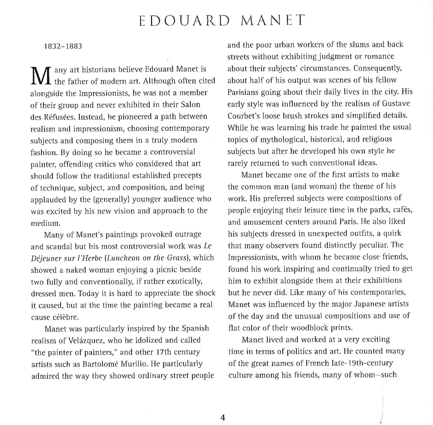 Many art historians consider Edouard Manet to be the father of modern art. Although often cites alongside the Impressionists, he was not a member of their group and next exhibited in their Salon des Refusees.