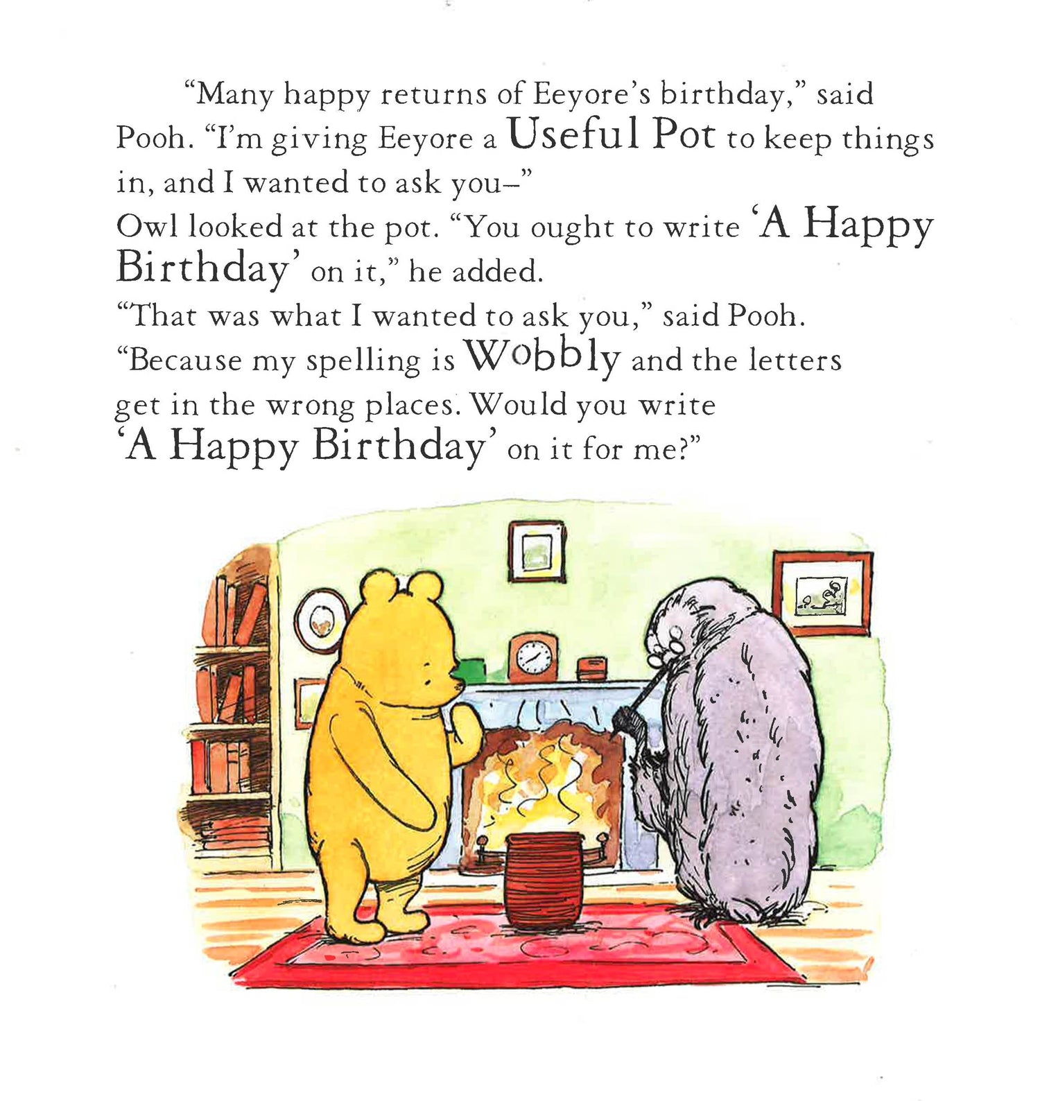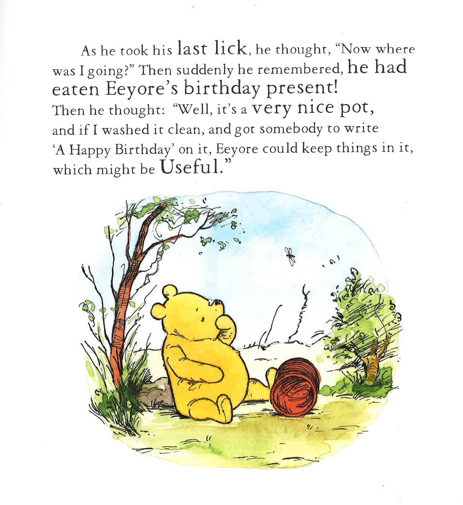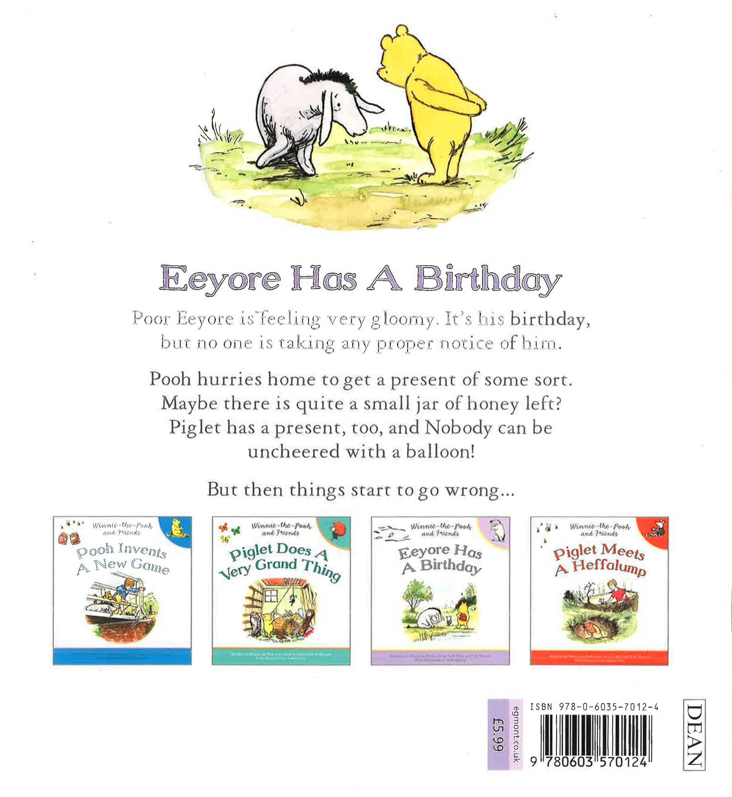 Poor Eeyore is feeling very gloomy. It's his birthday, but no one is taking any proper notice of him. Pooh hurries home to get a present of some sort. Maybe there is a quite a small jar of honey left? Piglet has a present, too, and Nobody can be uncheered with a balloon! But then things start to go wrong...