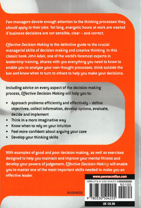 Effective Decision Making is the definitive guide to the crucial managerial skill of creative thinking. In this classic book John Adair, Britain's foremost expert on leadership training, tells you everything you need to know to enable you to analyse your own thought processes, think outside the box and know when to turn to others to help you make your decisions. Including advice on every aspect of the decision-making process, Effective Decision Making will help you to:
