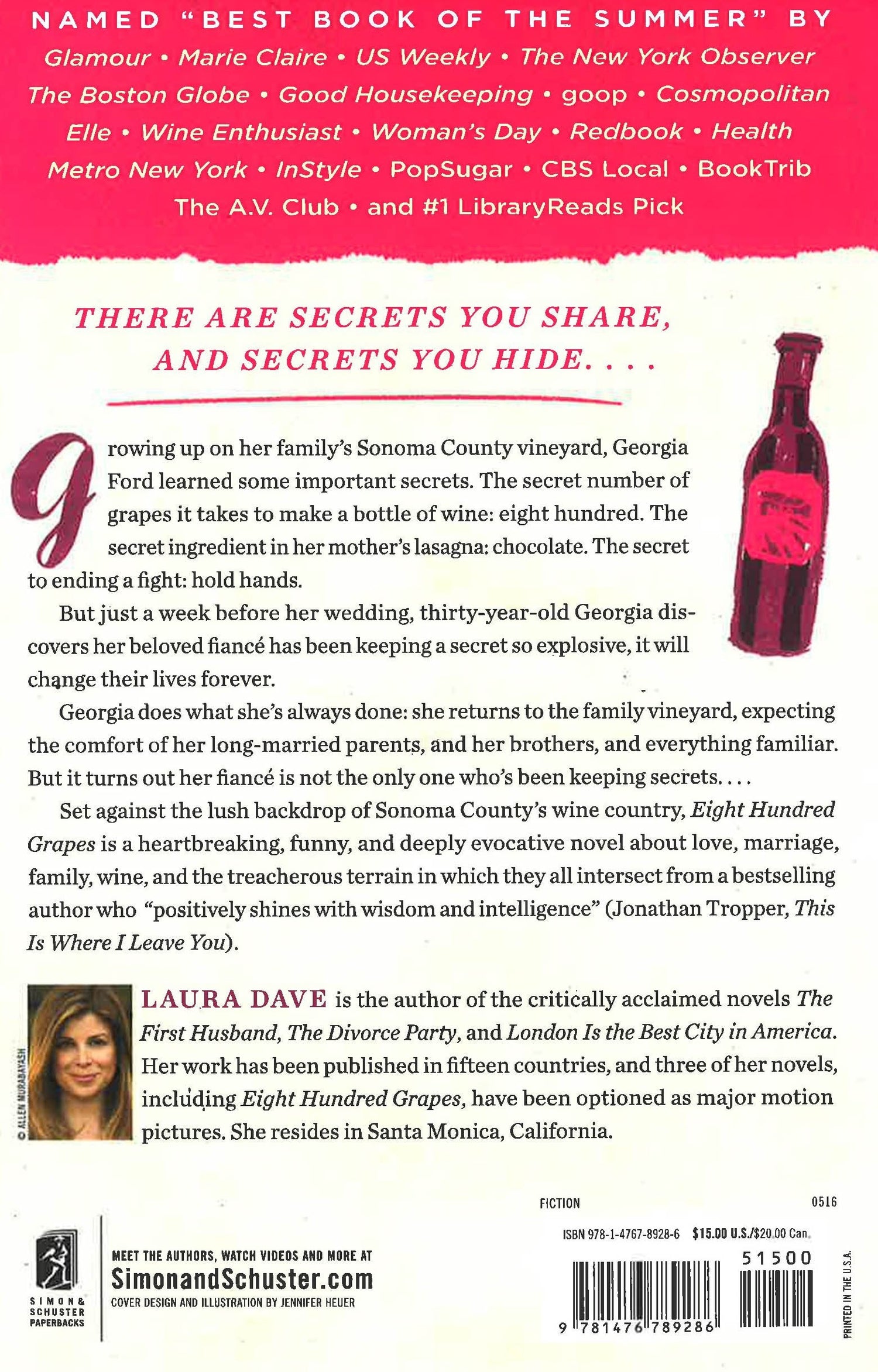 There are secrets you share, and secrets you hide . . . What if your beloved fiancé, he of the crinkly smile and irresistible British accent, had kept a life-changing secret from you? And what if, just a week before your dream wedding, you discovered it?Georgia Ford, bride-to-be, hops in her car and drives through the night, from Los Angeles to Sonoma, to her safe haven: her family, and the acclaimed family winery. Georgia craves the company of those who know her best, and whom she truly knows. Better yet, it’s the eve of the last harvest, the best time of the growing season, and Georgia knows she’ll find solace - and distraction - in the familiar rituals. But when Georgia arrives home, nothing is at all familiar. Her parents, her brothers, the family business, are all unrecognizable. It seems her fiancé isn’t the only one who’s been keeping secrets . . .