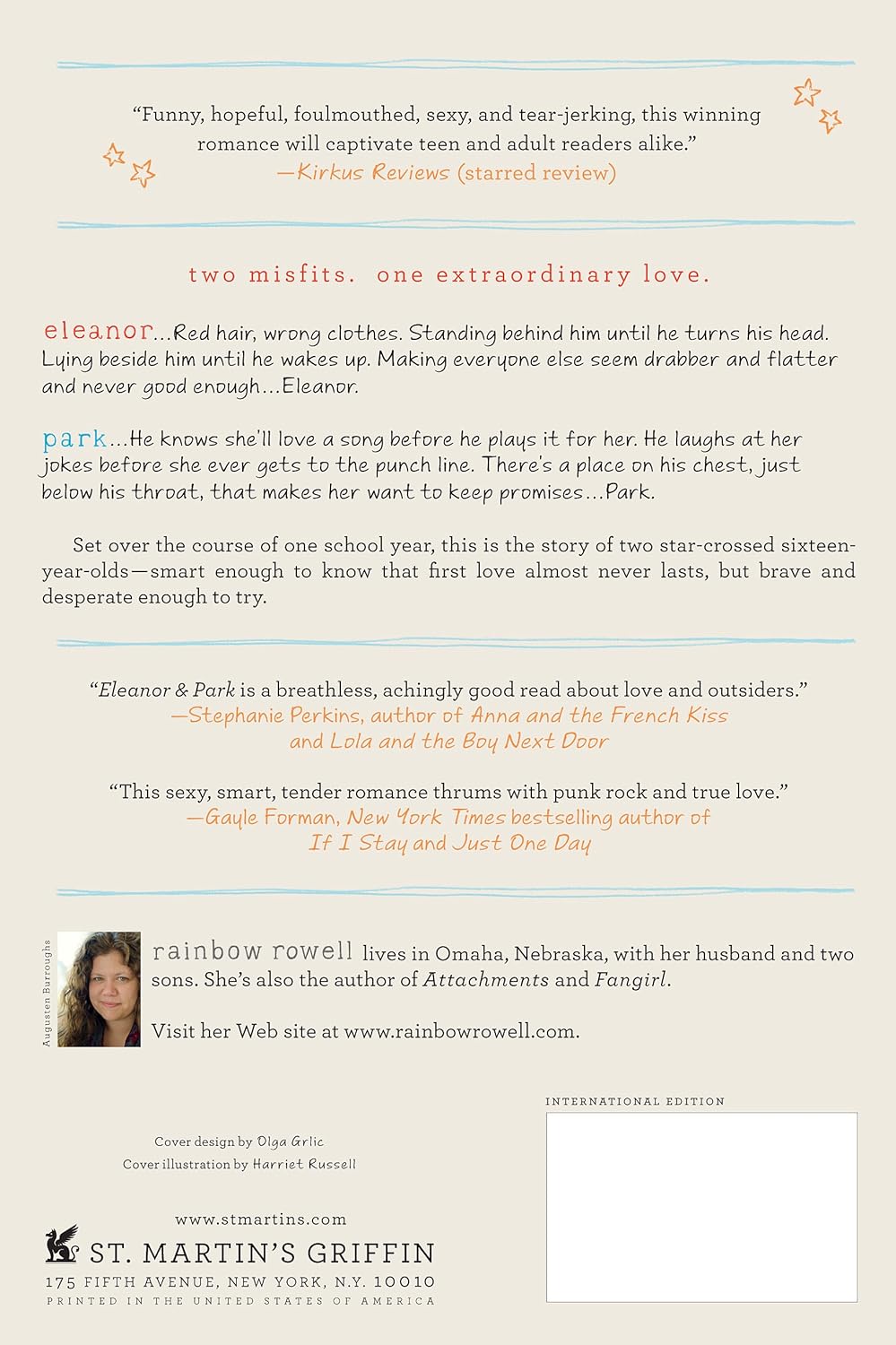 Eleanor... Red hair, wrong clothes. Standing behind him until he turns his head. Lying beside him until he wakes up. Making everyone else seem drabber and flatter and never good enough...Eleanor. Park... He knows she'll love a song before he plays it for her. He laughs at her jokes before she ever gets to the punch line. There's a place on his chest, just below his throat, that makes her want to keep promises...Park. Set over the course of one school year, this is the story of two star-crossed sixteen-year-olds smart enough to know that first love almost never lasts, but brave and desperate enough to try.