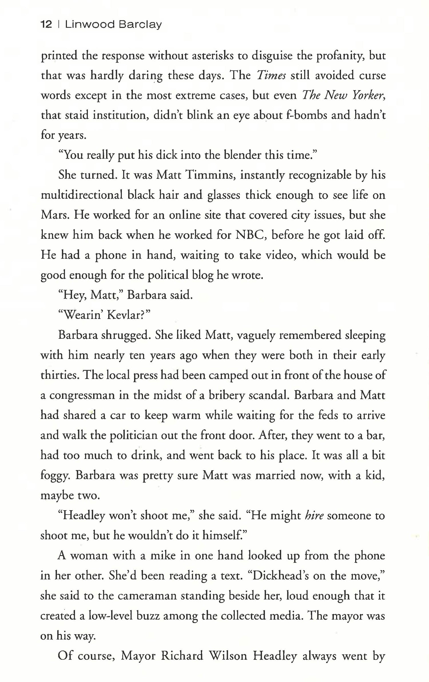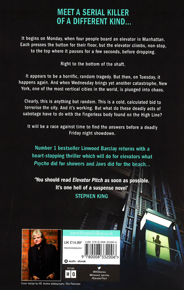 'You should read ELEVATOR PITCH by Linwood Barclay as soon as possible. It's one hell of a suspense novel' STEPHEN KING 'Moves as fast as a falling elevator and hits with just as much force. Linwood Barclay is a stone cold pro. ELEVATOR PITCH is a shameless good time' JOE HILL WHEN THE DOORS CLOSE, HE'S GOT YOU... It begins on a Monday, when four people board an elevator in Manhattan. Each presses the button for their floor, but the elevator climbs, non-stop, to the top where it pauses for a few seconds, before dropping. Right to the bottom of the shaft. It appears to be a horrific, random tragedy. But then, on Tuesday, it happens again. And when Wednesday brings yet another catastrophe, New York, one of the most vertical cities in the world is plunged into chaos. Clearly, this is anything but random. This is a cold, calculated bid to terrorize the city. And it's working. But what do these deadly acts of sabotage have to do with the fingerless body found on the High Line? It will be a race against time for detectives Jerry Borque and Lois Delgado to find the answers before a deadly Friday night showdown. Number one bestseller Linwood Barclay returns with a heart-stopping thriller which will do for elevators what Psycho did for showers and Jaws did for the beach... PRAISE FOR ELEVATOR PITCH: 'You should read ELEVATOR PITCH by Linwood Barclay as soon as possible. It's one hell of a suspense novel' STEPHEN KING 'This novel moves as fast as a falling elevator and hits with just as much force. Linwood Barclay is a stone cold pro and ELEVATOR PITCH is a shameless good time' JOE HILL 'A superior thriller' SUNDAY TIMES 'The twists keep coming' THE TIMES 'A great cast of characters,tension, humour and a thrilling ending; this book takes Linwood to new heights!' MARK EDWARDS 'Linwood Barclay presses all the right buttons' MICHAEL ROBOTHAM 'One of the finest thriller writers in the world at the very top of his game' MARK BILLINGHAM 'Genius ... but terrifying' THE SUN 'The plot is crammed with even more narrative twists than Barclay usually serves up ... it is delivered with considerable acumen' FINANCIAL TIMES