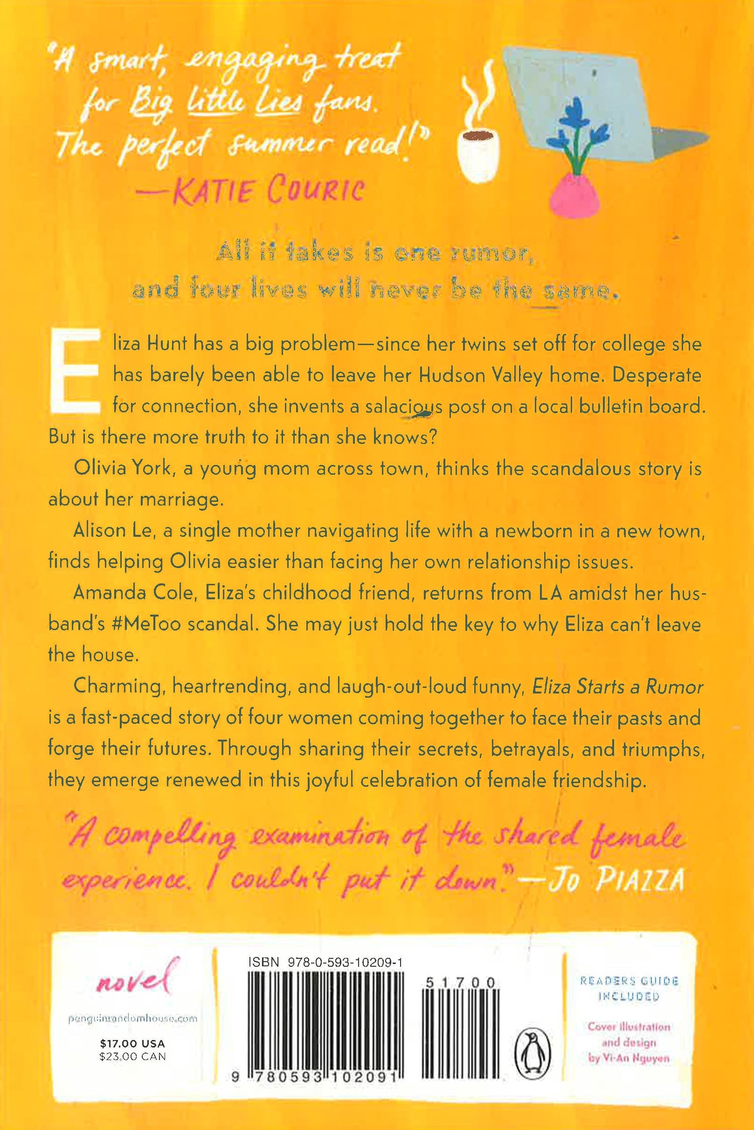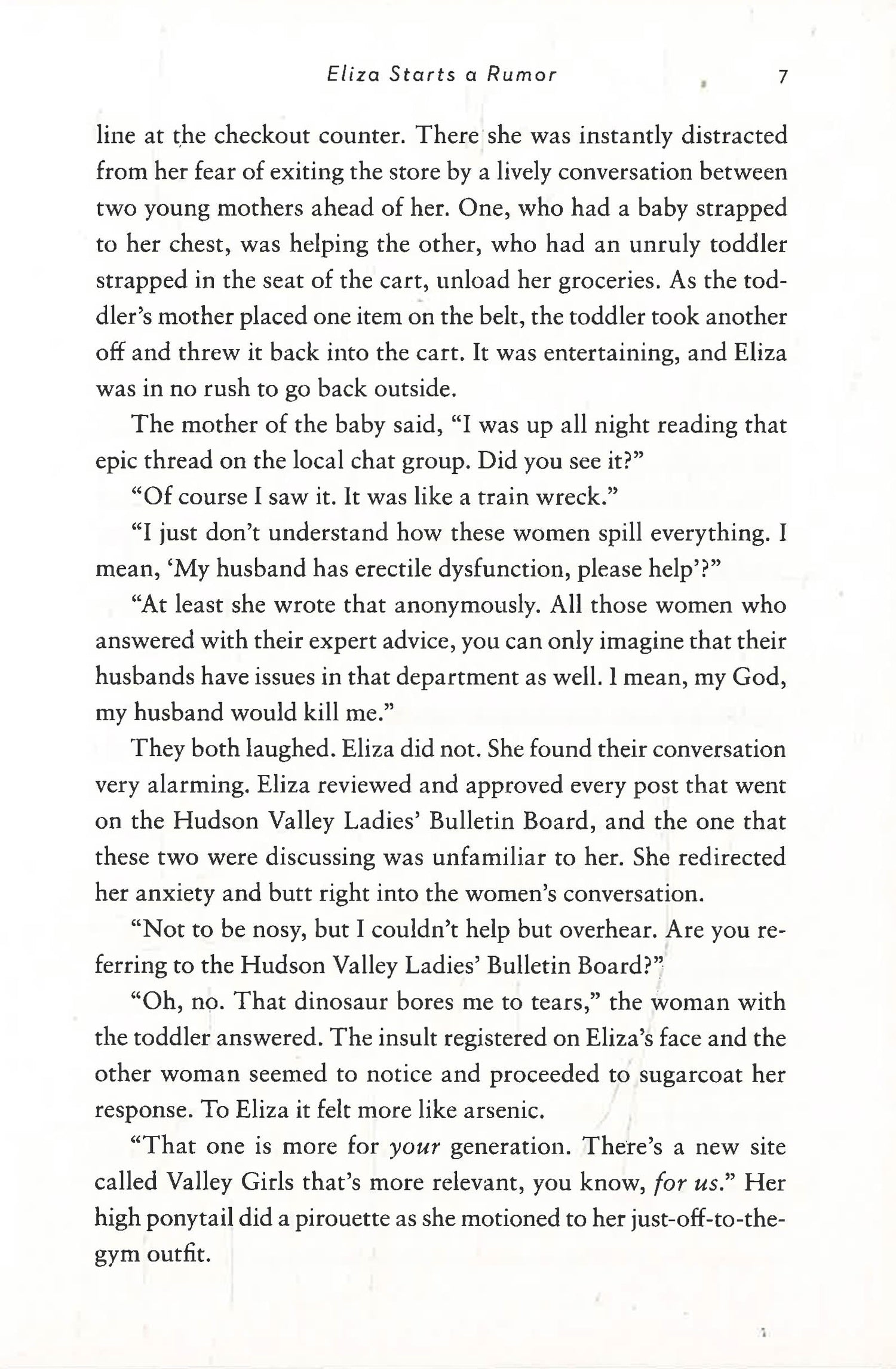 It wasn’t supposed to happen this way. When Eliza Hunt created The Hudson Valley Ladies’ Bulletin Board fifteen years ago she was happily entrenched in her picture-perfect suburban life with her husband and twin preschoolers. Now, with an empty nest and a crippling case of agoraphobia, the once-fun hobby has become her lifeline. So when a rival parenting forum threatens the site’s existence, she doesn’t think twice before fabricating a salacious rumor to spark things up a bit.