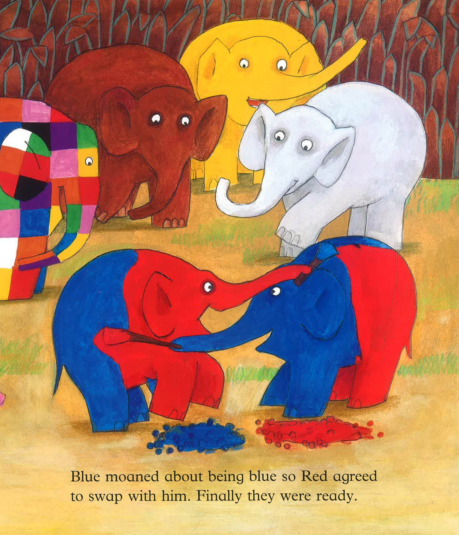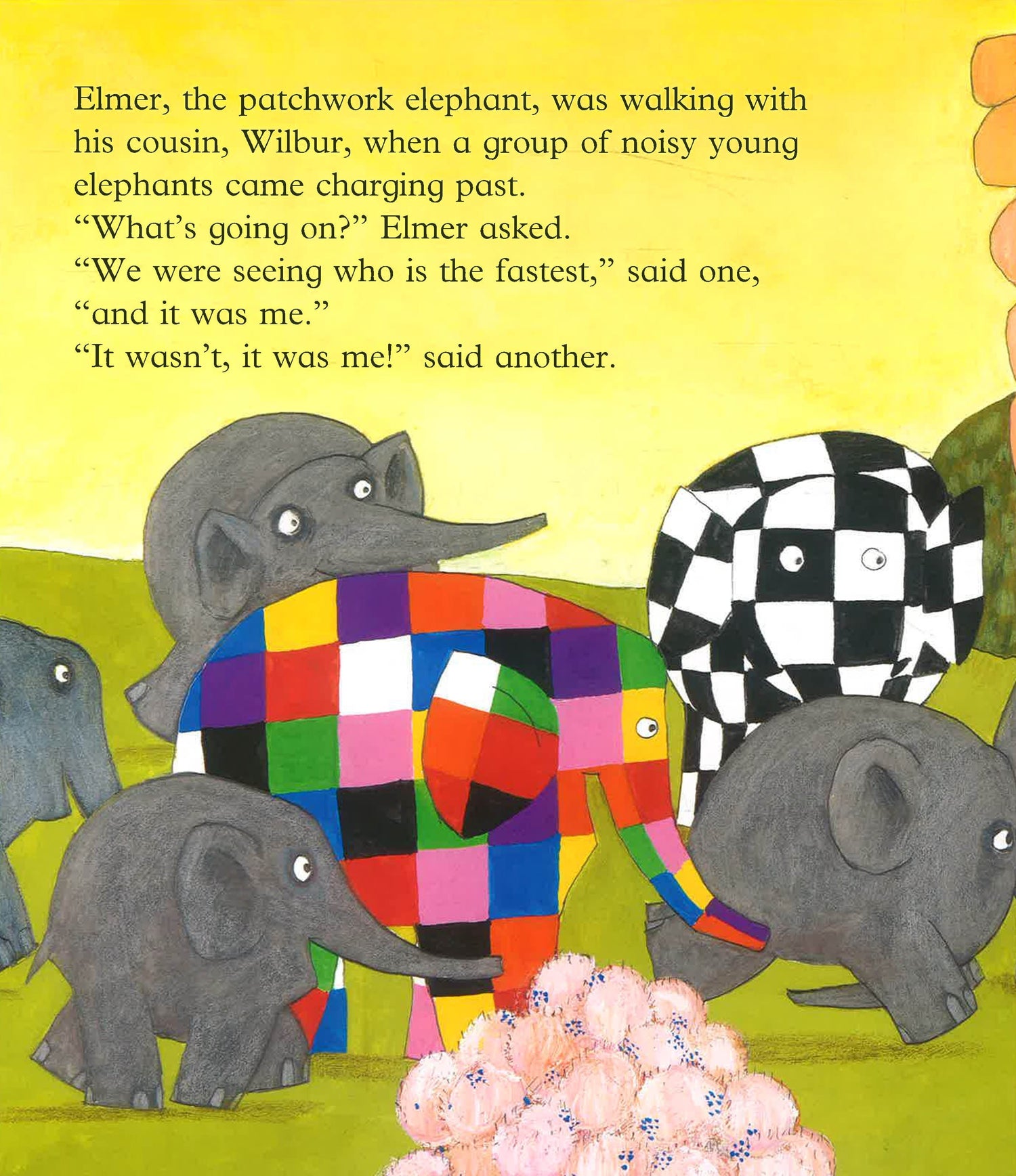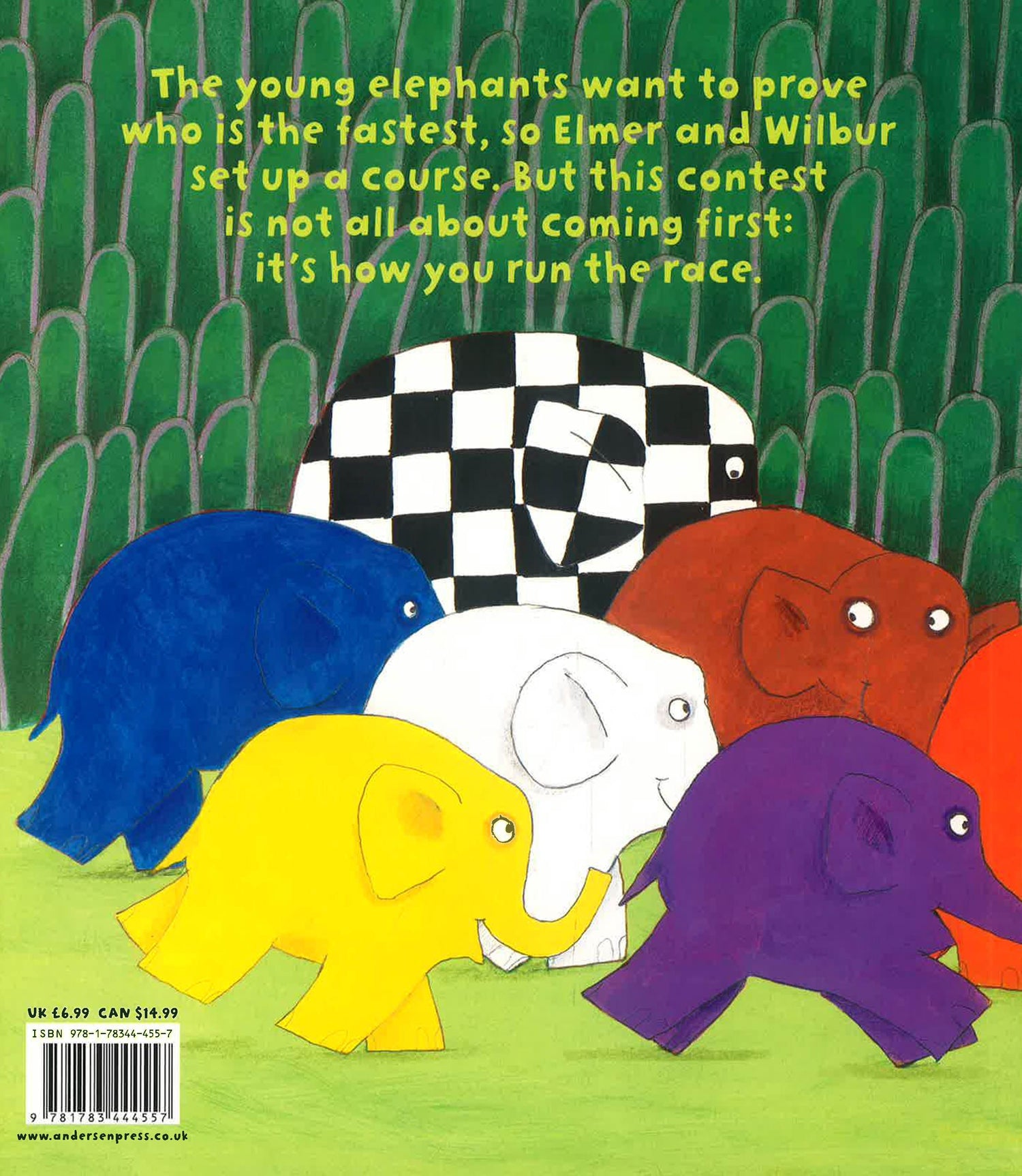 The young elephants want to prove who is the fastest, so Elmer and Wilbur organise a race. Each decorated a different colour, the racers set off around the course and discover things about themselves – Blue may be first and Orange second, but White is kind, Pink and Violet are funny and Yellow is a cheat. Luckily Yellow also learns he is very good at saying sorry, so each young elephant gets a medal from Elmer.
