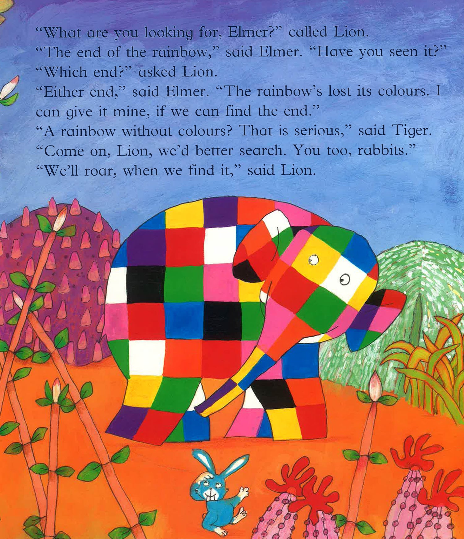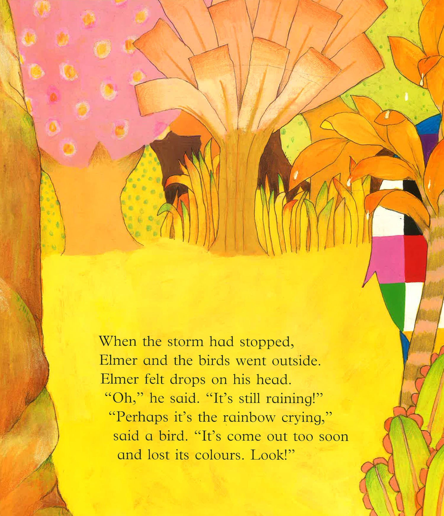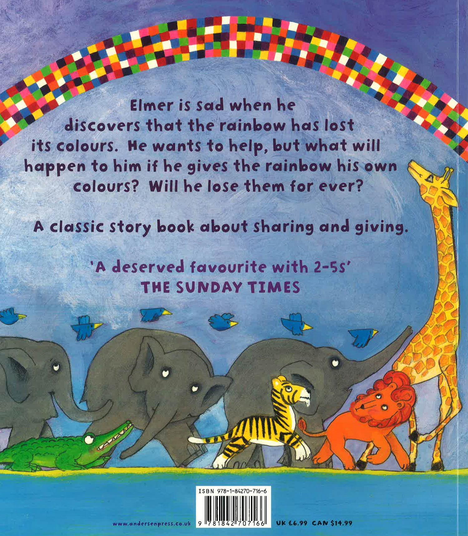 Elmer and the other elephants are waiting for the storm to end so they can see the beautiful, colourful rainbow. But something dreadful has happened: the rainbow has lost its colours! Elmer decides to give his own colours to the rainbow. But what will happen to Elmer if he gives the rainbow his own colours? Will he lose them for ever? Elmer and the other elephants are waiting for the storm to end so they can see the beautiful, colourful rainbow. But something dreadful has happened: the rainbow has lost its colours! Elmer decides to give his own colours to the rainbow. But what will happen to Elmer if he gives the rainbow his own colours? Will he lose them for ever?