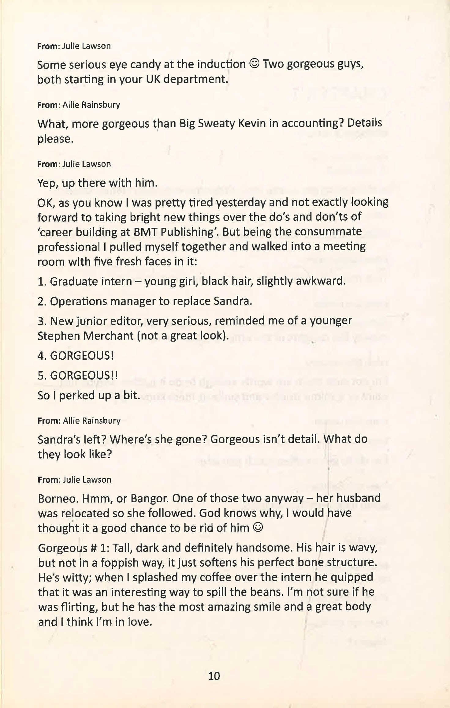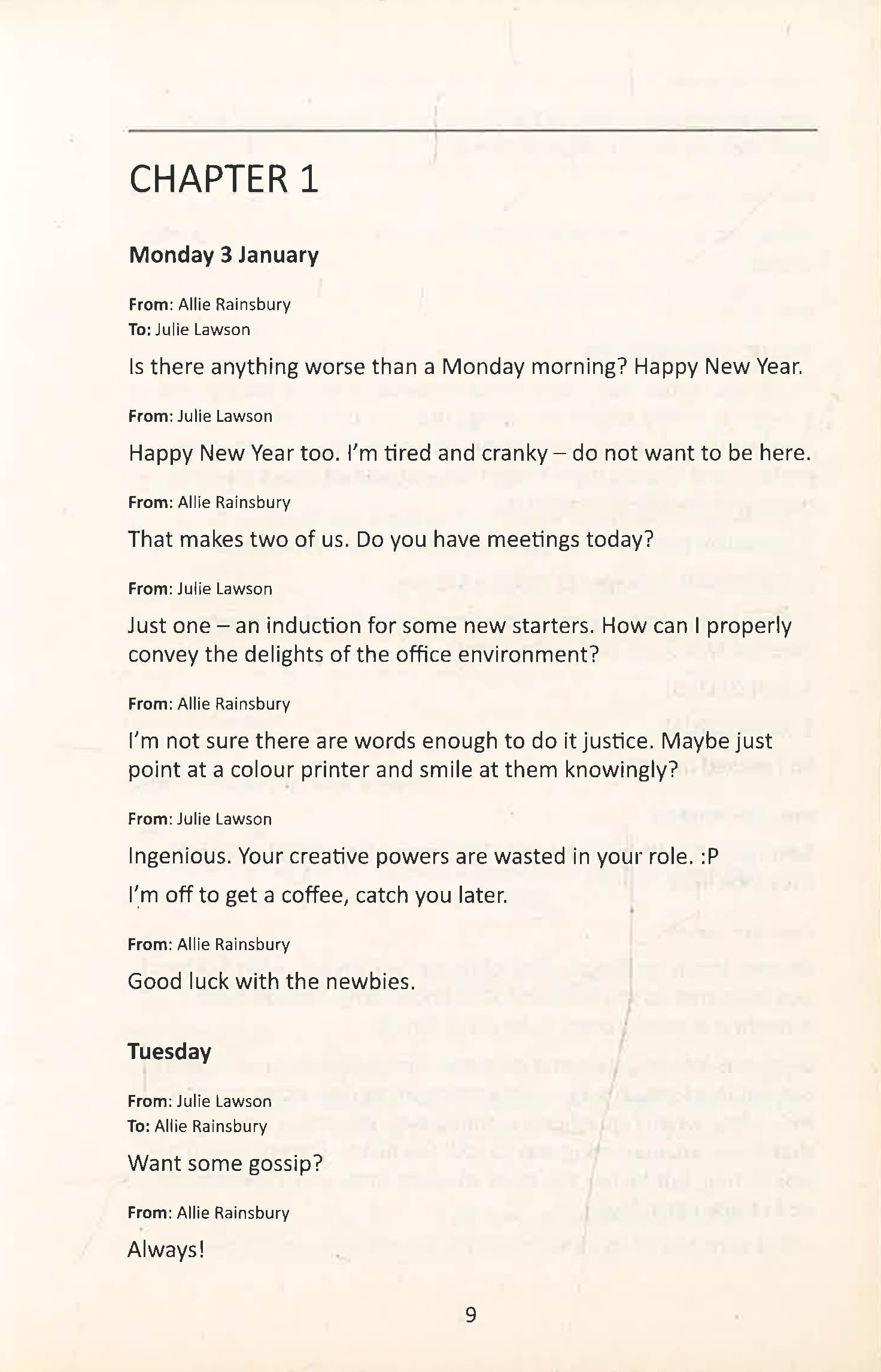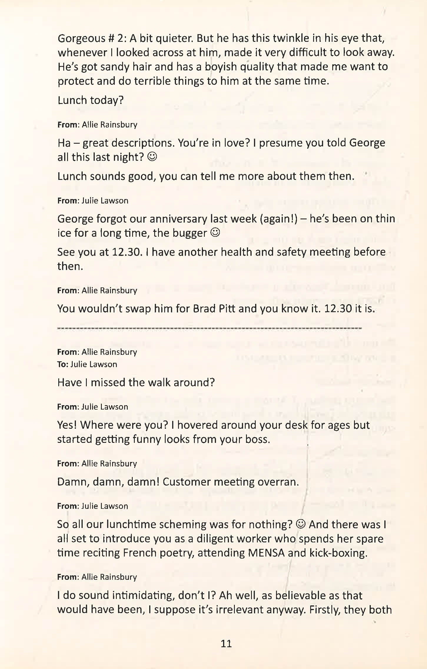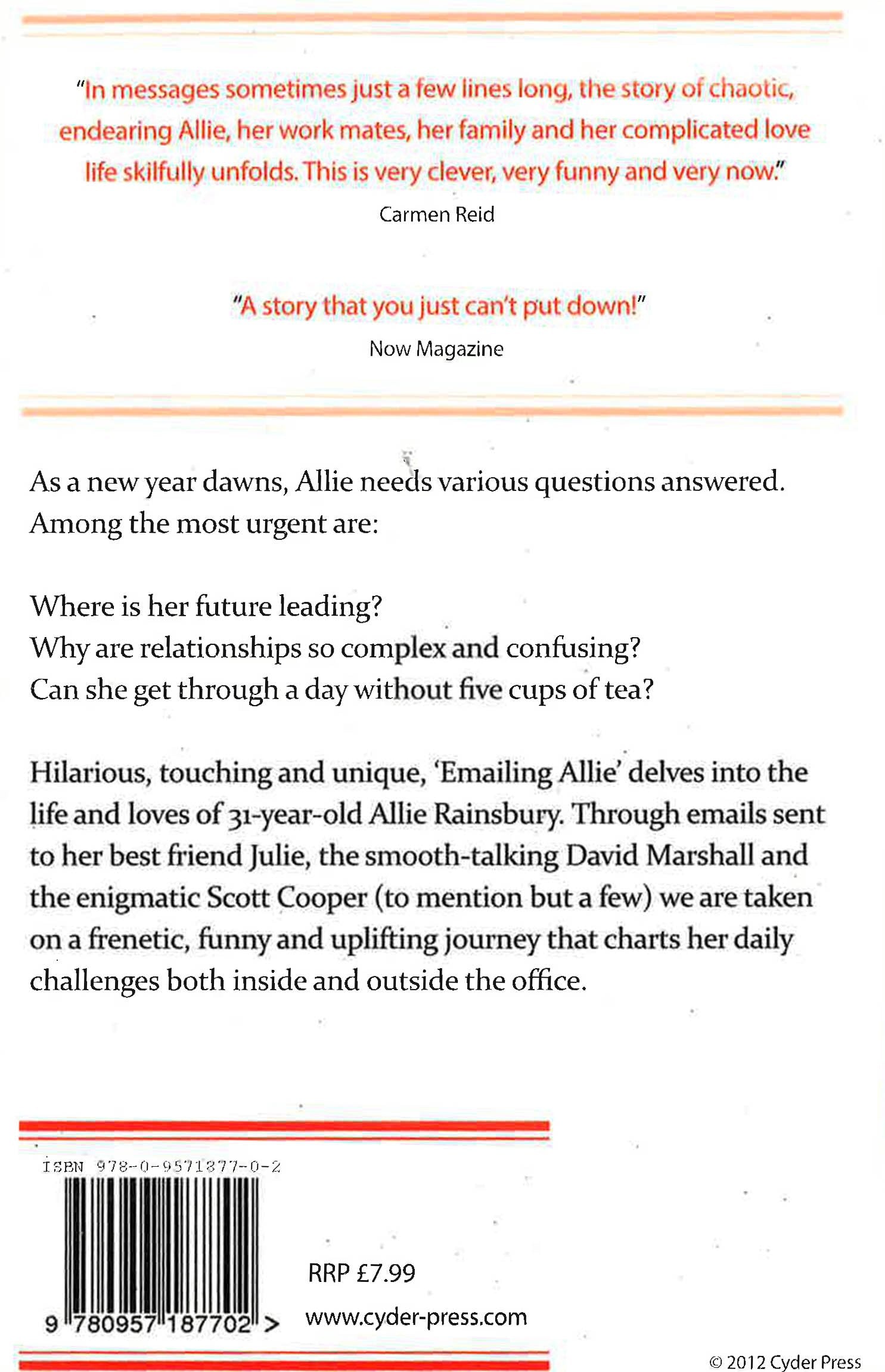 As a new year dawns, Allie needs various questions answered. Among the most urgent are: Where is her future leading? Why are relationships so complex and confusing? Can she get through a day without five cups of tea? Hilarious, touching and unique, Emailing Allie delves into the life and loves of 31-year-old Allie Rainsbury. Through emails sent to her best-friend Julie, the smooth-talking David Marshall and the enigmatic Scott Cooper (to mention but a few) we are taken on an frenetic, funny and uplifting journey that charts her daily challenges both inside and outside the office.