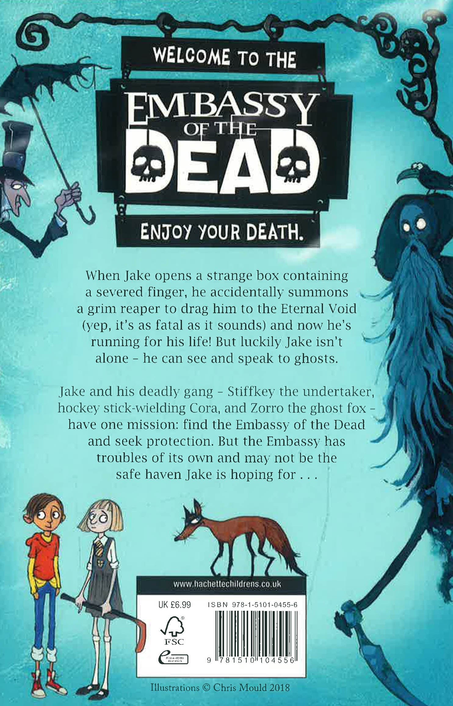 The first book in a spookily funny new series, where the living meet the dead and survival is a race against time. Perfect for fans of Skulduggery Pleasant and Who Let the Gods Out. The first book in a spookily funny new series, where the living meets the dead and survival is a race against time. Perfect for fans of Skulduggery Pleasant and Who Let the Gods Out.Welcome to the Embassy of the Dead. Leave your life at the door. (Thanks.)When Jake opens a strange box containing a severed finger, he accidentally summons a grim reaper to drag him to the Eternal Void (yep, it's as fatal as it sounds) and now he's running for his life! But luckily Jake isn't alone - he can see and speak to ghosts.Jake and his deadly gang (well dead, at least) - Stiffkey the undertaker, hockey stick-wielding, Cora, and Zorro the ghost fox - have one mission: find the Embassy of the Dead and seek protection. But the Embassy has troubles of its own and may not be the safe haven Jake is hoping for . . .