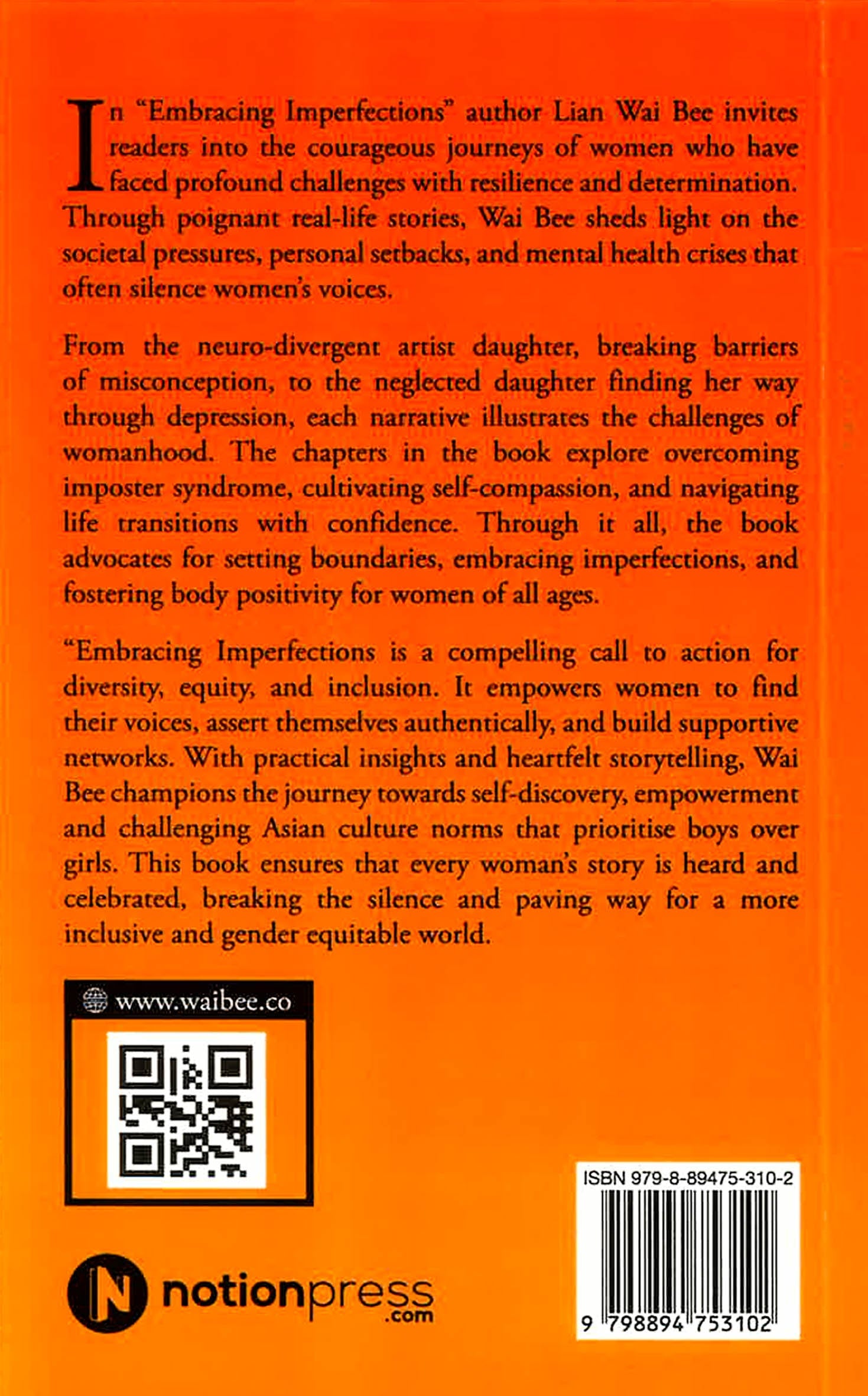 In "Embracing Imperfections" author Lian Wai Bee invites readers into the courageous journeys of women who have faced profound challenges with resilience and determination. Through poignant real-life stories, Wai Bee sheds light on the societal pressures, personal setbacks, and mental health crises that often silence women's voices. From the neuro-divergent artist daughter, breaking barriers of misconception, to the neglected daughter finding her way through depression, each narrative illustrates the challenges of womanhood. The chapters in the book explore overcoming imposter syndrome, cultivating self-compassion, and navigating life transitions with confidence. Through it all, the book advocates for setting boundaries, embracing imperfections, and fostering body positivity for women of all ages. "Embracing Imperfections is a compelling call to action for diversity, equity, and inclusion. It empowers women to find their voices, assert themselves authentically, and build supportive networks. With practical insights and heartfelt storytelling, Wai Bee champions the journey towards self-discovery, empowerment and challenging Asian culture norms that prioritise boys over girls. This book ensures that every woman's story is heard and celebrated, breaking the silence and paving way for a more inclusive and gender equitable world.