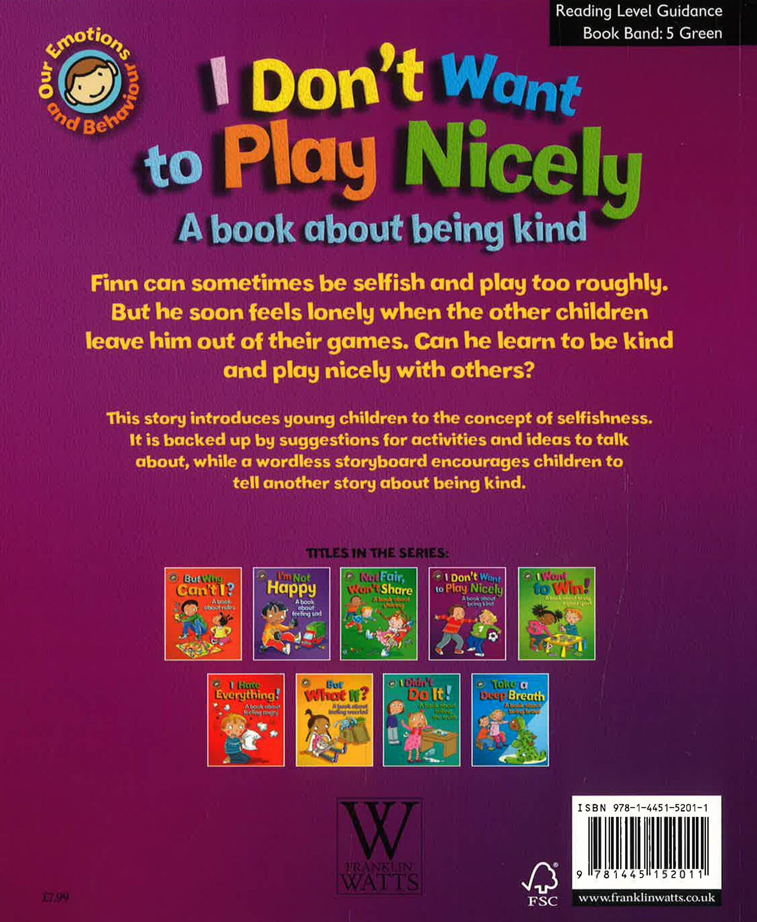 A gentle picture book that examines the issues of selfishness, aggression and kindness in a reassuring way - perfect for young children who struggle with aggressive behaviour. The story offers a way in to talk about how our actions can make others feel and how we can make that better, reinforcing good behaviour. At the end of the story, there are notes for parents and teachers with suggestions of ways to help children deal with the big emotions they experience. Finn struggles with caring for other children at school. He can be selfish and he often plays too aggressively. When the other children complain, Mr Hare has an idea. He chooses Finn as the buddy for Jake, a new boy at school. However, Finn does not help Jake, and the other children become really upset with Finn for being so unkind. Finn is soon left out by the other children and is left feeling miserable and lonely. Can Mr Hare help Finn find a way to make it all better?This book is part of a series, Our Emotions and Behaviour, which is perfect for sharing with children as a gentle means of identifying and discussing their emotions, boosting their confidence and helping social and emotional development. Each book has a fun story which is backed up by suggestions for activities and ideas to talk through together and a wordless storyboard for children to tell a story themselves and reinforce the story's message. The series supports the Personal, Social and Emotional Development Area of Learning in the Early Years Foundation Stage.