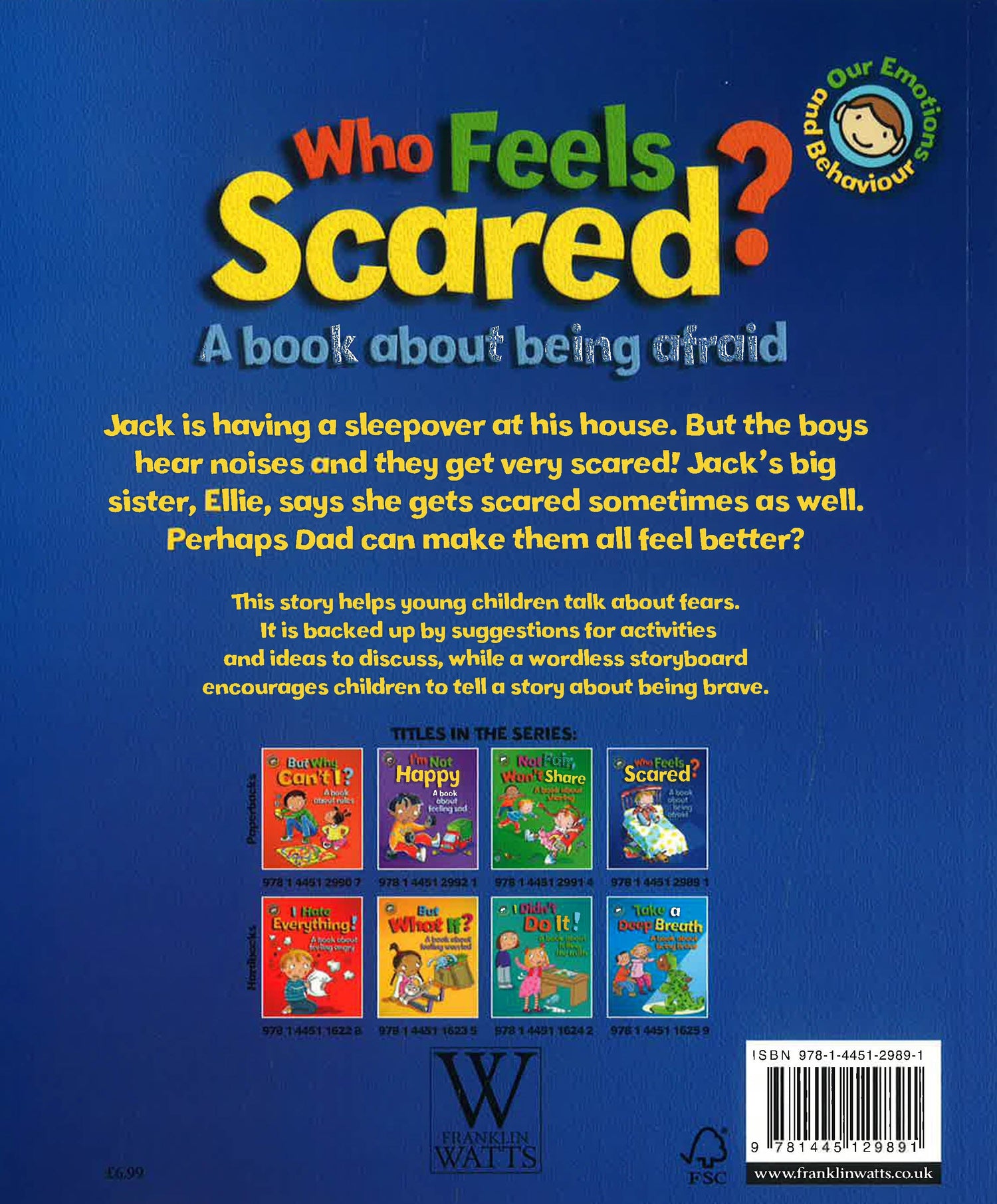 Jack is having a sleepover at his house. But the boys hear noises and they get very scared! Jack's big sister Ellie says she gets scared sometimes as well. Perhaps Dad can make them all feel better? This series introduces young children to different aspects of our emotions and behaviour. A fictional story is backed up by suggestions for activities and ideas to talk about, while a wordless storyboard encourages children to tell another story.