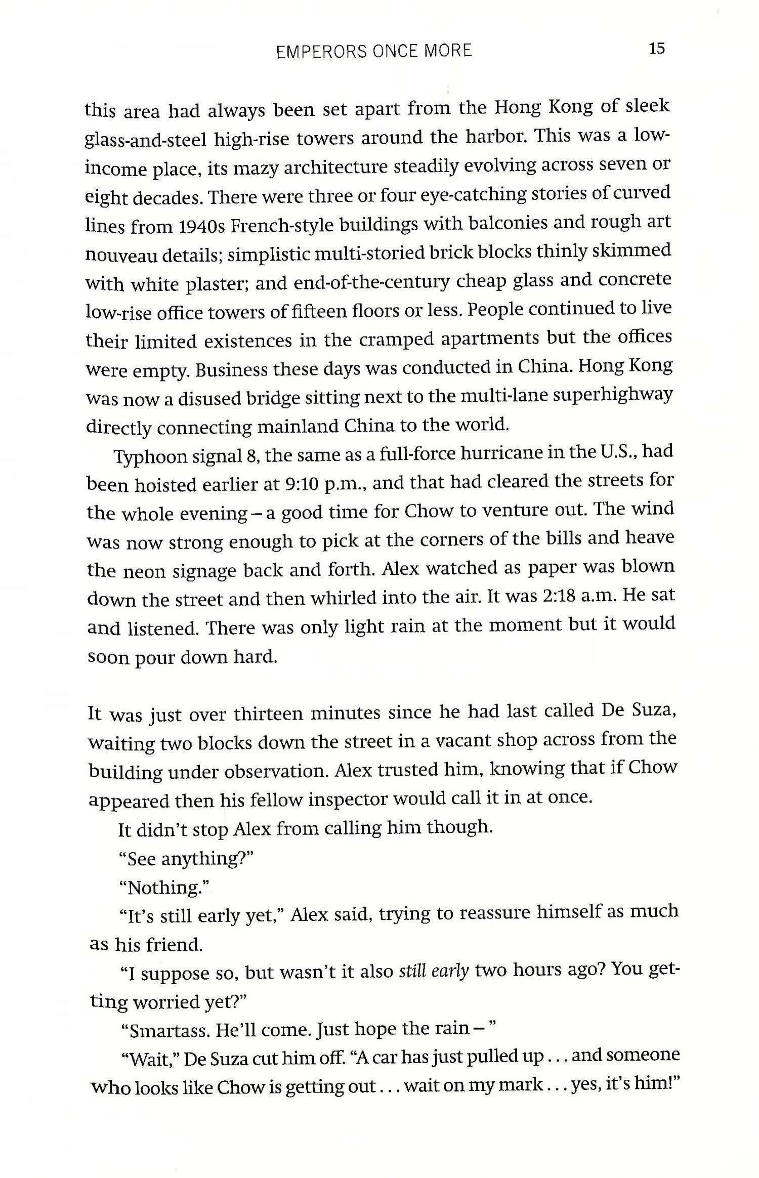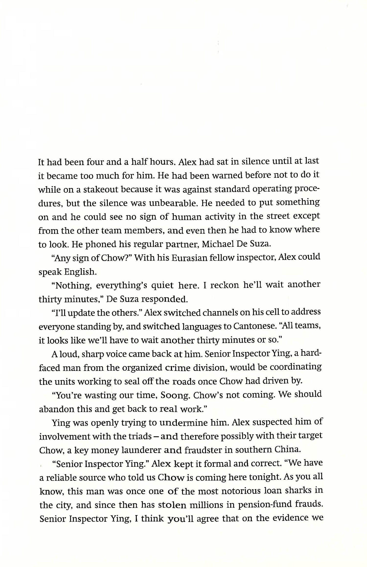 On the same day as he is drafted in to help Inspector Mike De Suza with the investigation of the motiveless murder of two Chinese Methodists in the financial district, the police are tipped off to an apparently unrelated murder in a deserted Kowloon warehouse: five people dead in a scene of horror which echoes the ritualistic killings of the Boxer Rebellion, a century before. As the first officer on the scene, Alex is shocked to be greeted by the concealed perpetrator, and invited to join him in reasserting China's global supremacy. After dismissing this and a second approach, he recruits historian Professor Elizabeth Yi to help him research the cases' parallels with the Boxer killings.