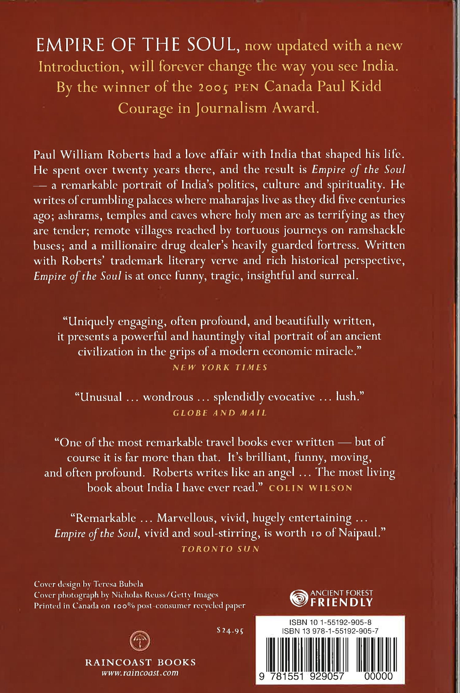 Paul William Roberts's journeys through India span twenty years, and in Empire of the Soul, he creates a dazzling mosaic, by turns tragic and comic, of the subcontinent and its people. From the crumbling palaces of maharajas to the slums of Calcutta; from the ashrams of holy men to a millionaire drug dealer's heavily guarded fortress on India's border with China, Roberts captures the lure of this enigmatic land—this empire of the soul. "India is a harsh mistress," he writes. "She seems to appreciate individual sacrifice so little. Yet she has never wanted for lovers..."