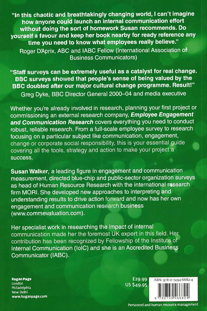 The complete handbook to measuring and evaluating employee engagement and offers a guide to implementing change based on results.There's a well-known saying: what doesn't get measured doesn't get done. So it is no surprise that communicators, human resource and change managers and other professionals recognise the need to measure and evaluate their work, particularly its worth to their organization and seek the most effective ways to achieve this. Whether you're already involved in research, planning your first project or commissioning an external research company, Employee Engagement and Communication Research covers everything you need to know in order to conduct robust, reliable research. Whether it's a full-scale employee survey or research focusing on a particular subject area such as communication, engagement, change or corporate social responsibility, Employee Engagement and Communication Research is your essential guide covering all the tools, strategy and actions to make your project a success.