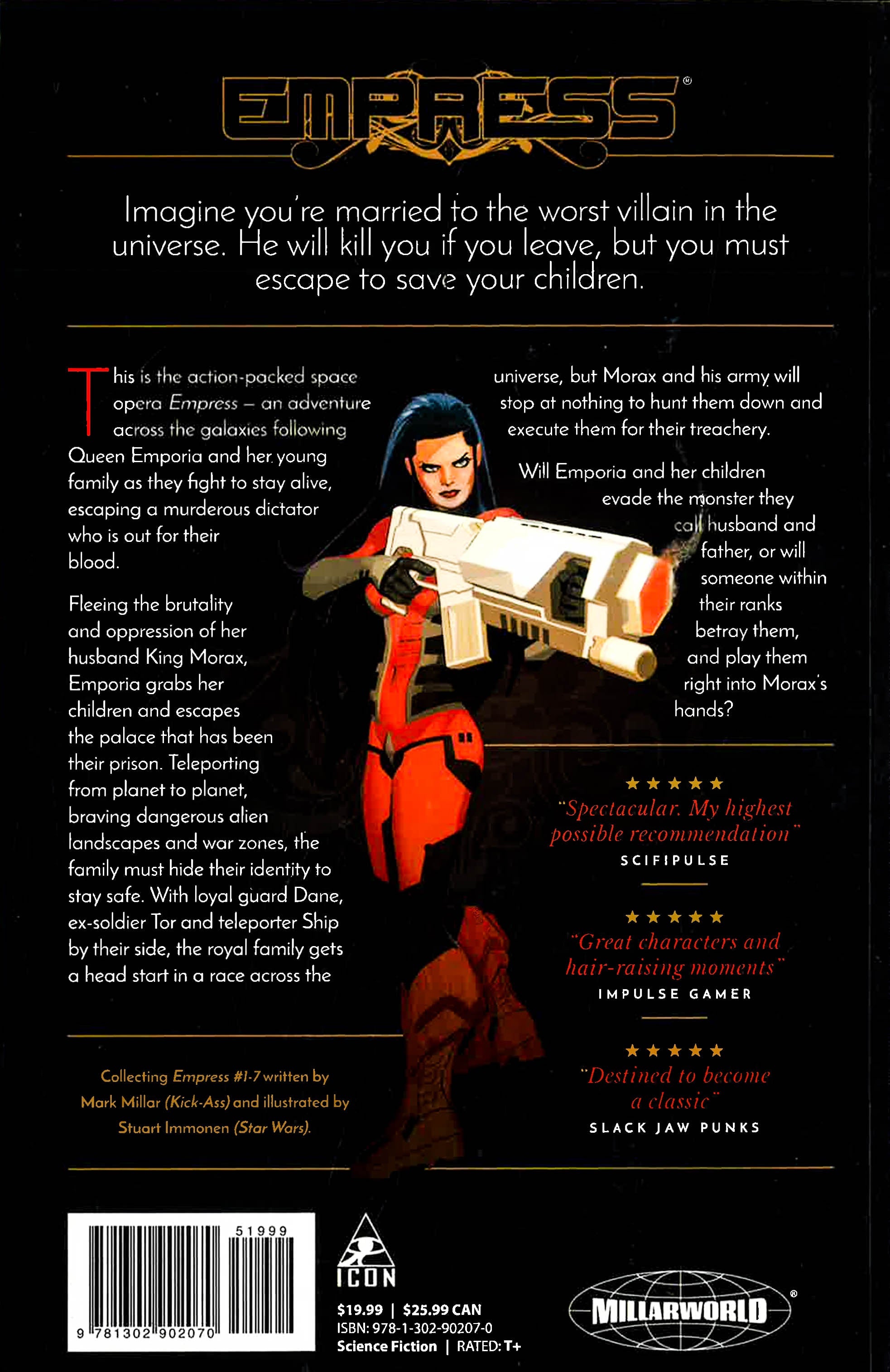 Imagine you're married to the worst bad guy from your favorite sci-fi movie. An alien dictator feared throughout the universe, who will kill you if you leave - but you need to escape for the sake of your three children. That's the life of Queen Emporia. All she has is her wits, her bodyguard, and three guns to get her kids across the galaxy - and her husband Morax's forces are in hot pursuit. Easy, right? Their desperate race for their lives will take them through interplanetary war zones, across dead worlds and into the path of monstrous beasts! Danger piles upon danger when slavers circle and a tribal priestess thirsts for a blood sacrifice! All the while, Morax executes anyone and everyone in his way. Welcome to Empress, your new favorite comic! COLLECTING: EMPRESS 1-7