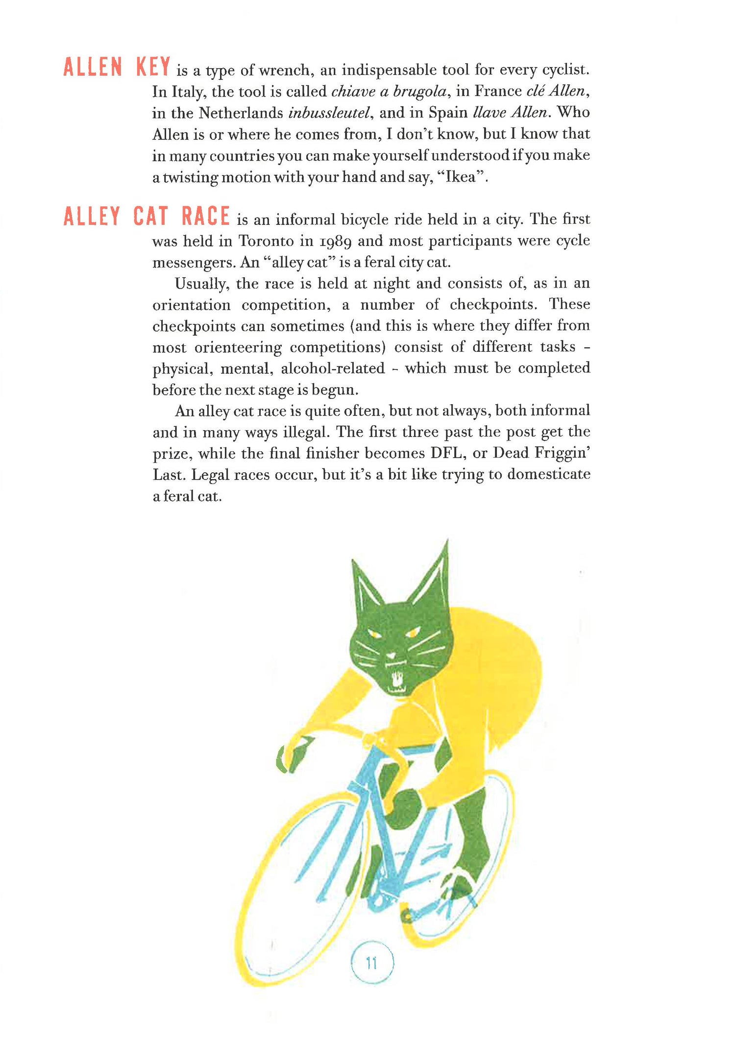 Beautifully illustrated and arranged alphabetically with hundreds of entries ranging from Tour de France stages to illegal 'Alley Cat' races, as well as cult heroes and must-know cycling slang, Tell's book provides an insight into this complex world that only a cycling junkie can.