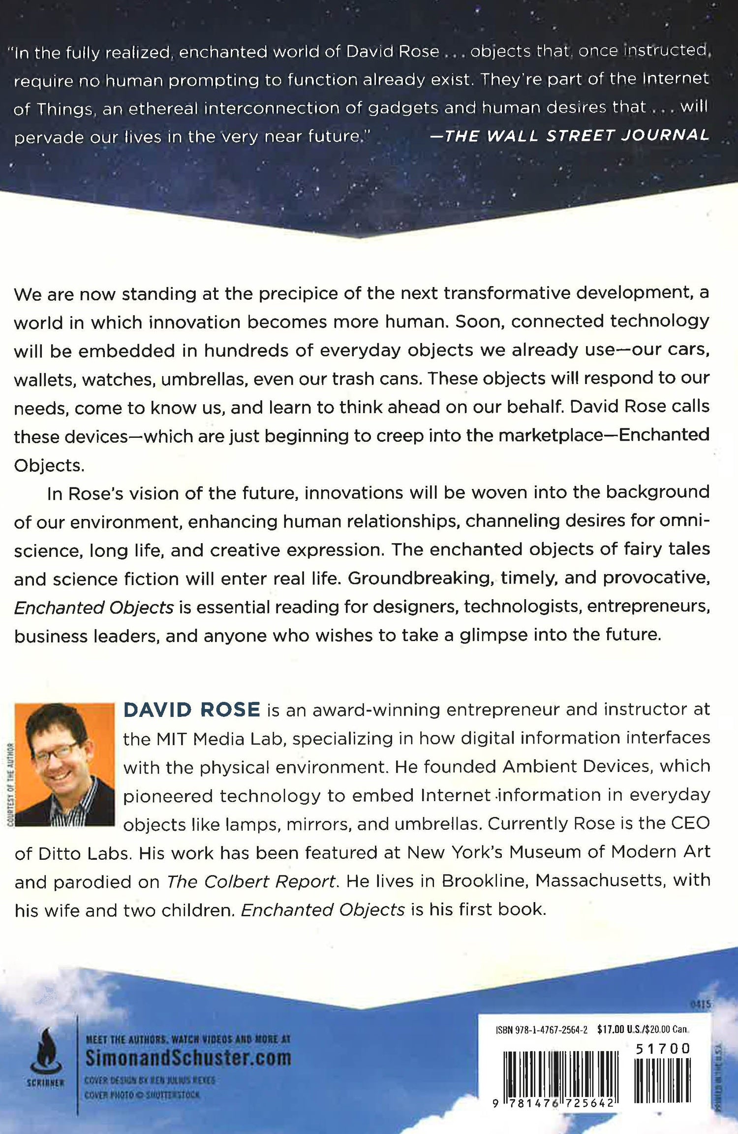 In the tradition of Who Owns the Future, an MIT Media Lab scientist imagines how everyday objects can intuit our needs, improve our lives, and form "an ethereal interconnection of gadgets and human desires that...will pervade our lives in the very near future" (The Wall Street Journal). We are now standing at the precipice of the next transformative development, a world in which technology becomes more human. Soon, connected technology will be embedded in hundreds of everyday objects we already use: our cars, wallets, watches, umbrellas, even our trash cans. These objects will respond to our needs, come to know us, and even learn to think ahead on our behalf. David Rose calls these devices - which are just beginning to creep into the marketplace - Enchanted Objects. In Rose's vision of the future, technology atomizes, combining itself with the objects that make up the very fabric of daily living. Such innovations will be woven into the background of our environment, enhancing human relationships, channeling desires for omniscience, long life, and creative expression. The enchanted objects of fairy tales and science fiction will enter real life. Groundbreaking, timely, and provocative, Enchanted Objects is a "delightful" (The New York Times) blueprint for a better future, where efficient solutions come hand in hand with technology that delights our senses. It is essential reading for designers, technologists, entrepreneurs, business leaders, and anyone who wishes to take a glimpse into the future.
