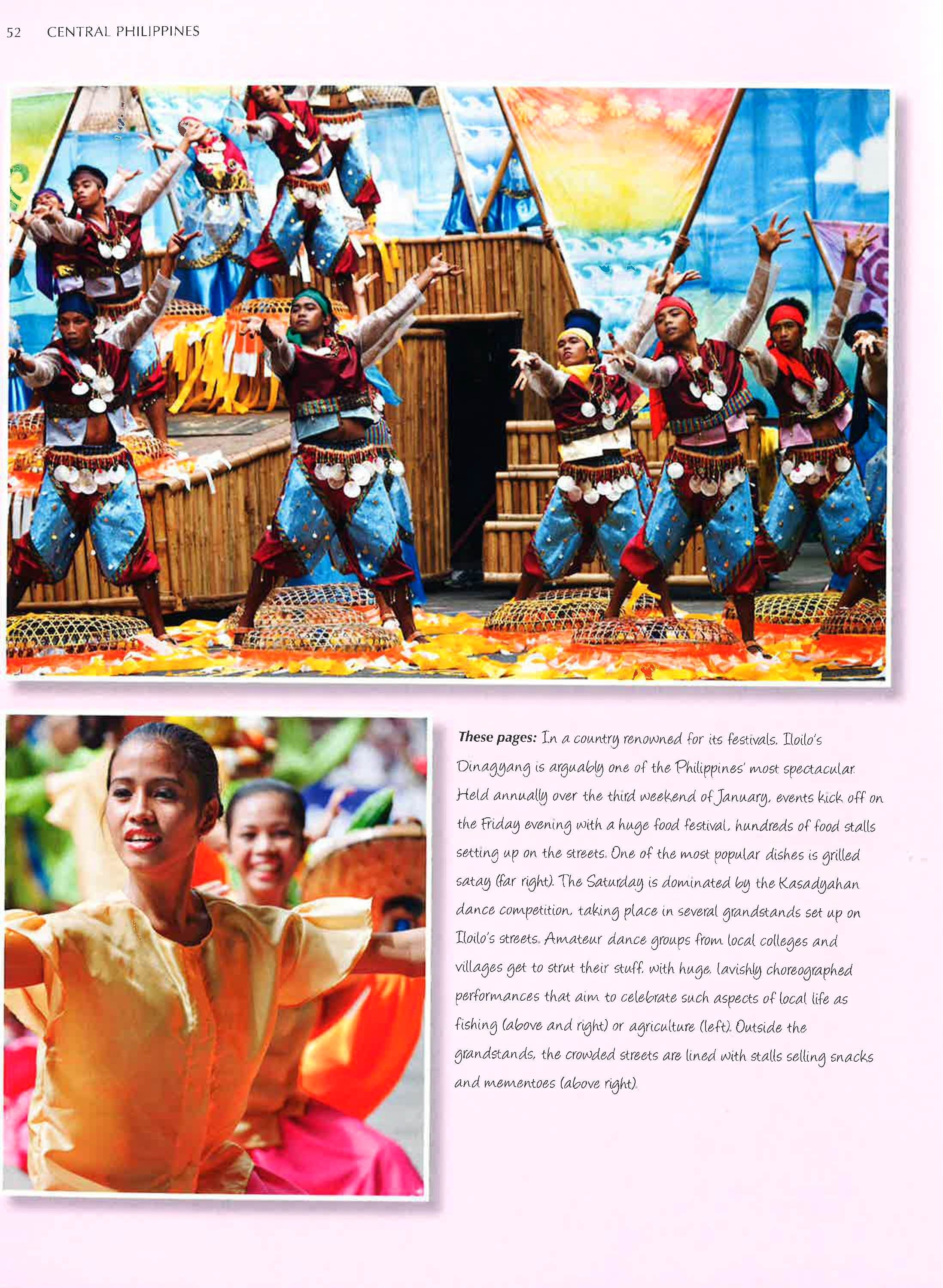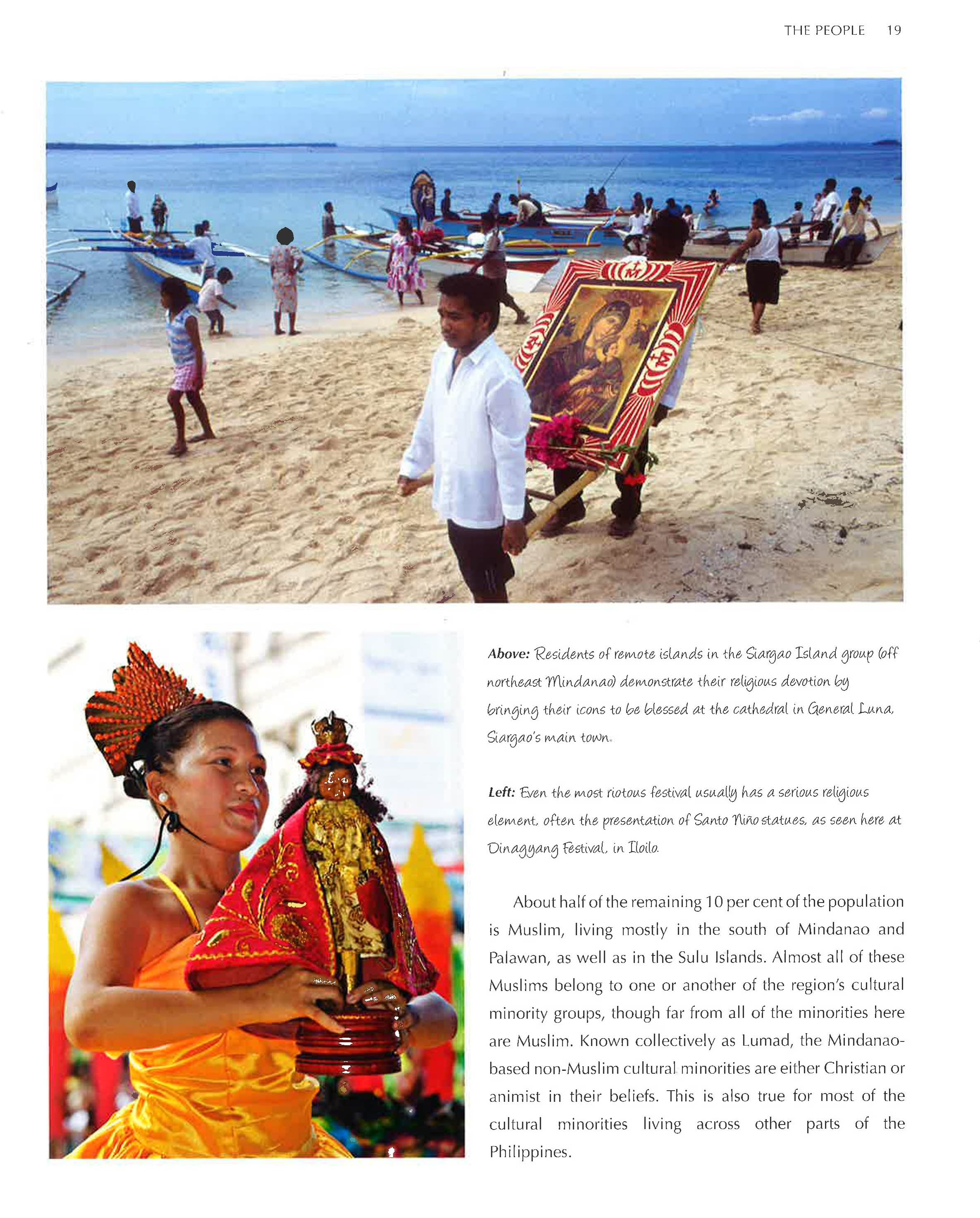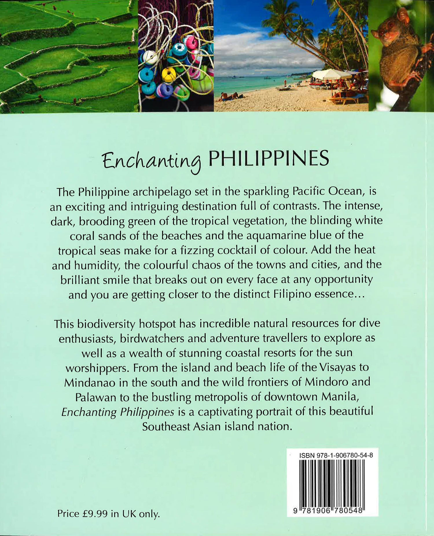 The intense, dark brooding green of the tropical vegetation, the blinding white coral sands of the beaches, and the aquamarine blue of the surrounding tropical seas make for a fizzing cocktail of colour. Add the heat and humidity, suffused with the smells of cooking and tropical fruit hanging in the air; the colourful chaos of the towns and cities, and the brilliant smile that seems ready to erupt from any face at the slightest "provocation", and you are getting closer to the distinct Filipino essence...From the island and beach life of the Visayas to Mindanao in the south, and from the wild frontiers of Mindoro and Palawan to the bustling metropolis of downtown Manila, Enchanting Philippines is a captivating portrait of this beautiful Southeast Asian island nation.