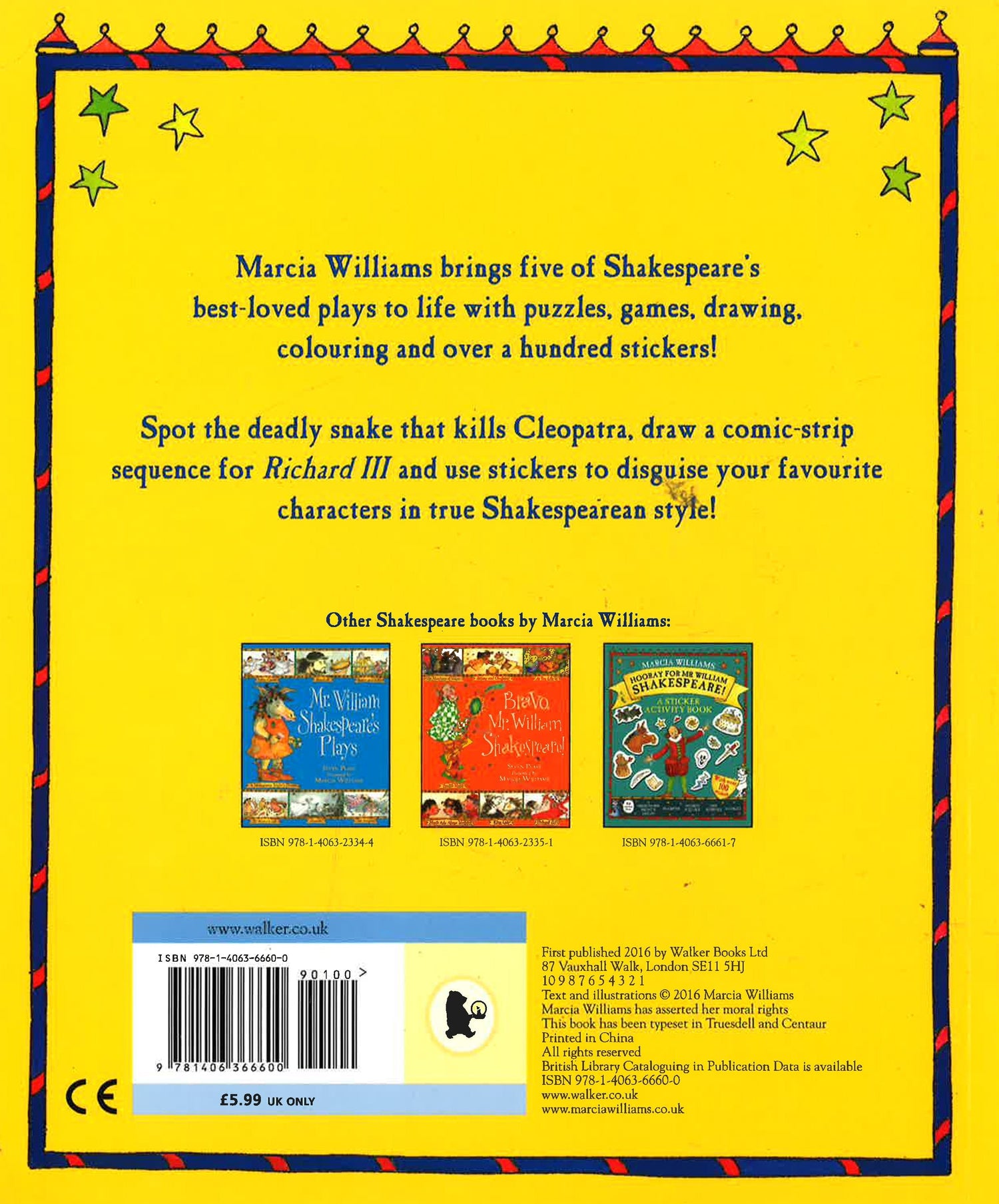 A brilliantly original and creative sticker activity book from master storyteller Marcia Williams, celebrating Mr William Shakespeare and five of his best-loved plays.Explore five of Mr William Shakespeare's best-loved plays with this brilliantly original sticker activity book from bestselling author/illustrator Marcia Williams. Featuring activities inspired by The Merchant of Venice, Richard III, Much Ado About Nothing, Antony and Cleopatra and Twelfth Night. Use your stickers to help Portia disguise herself as a lawyer to save the merchant of Venice, put Richard III on the battlefield ready for his final battle, and learn to translate hieroglyphics to find out what Cleopatra is saying to Antony! A fun-packed, interactive interactive introduction to Shakespeare, with word searches, mazes, drawing, colouring and over a hundred stickers!