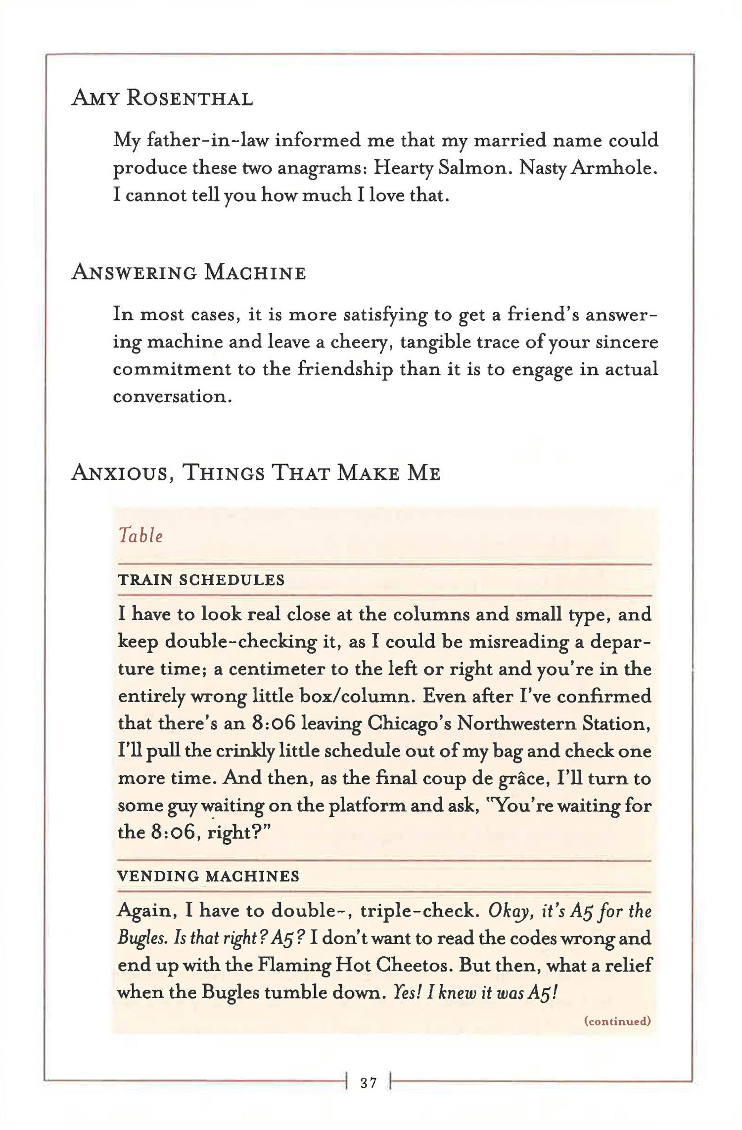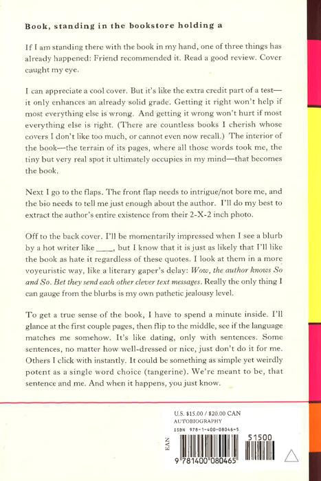 From the author of the viral Modern Love column, "You May Want to Marry My Husband." In Encyclopedia of an Ordinary Life, Amy Krouse Rosenthal has ingeniously adapted the centuries-old format of the encyclopedia to convey the accumulated knowledge of her lifetime in a poignant, wise, often funny, fully realized memoir. Using mostly short entries organized from A to Z, many of which are cross-referenced, Rosenthal captures in wonderful and episodic detail the moments, observations, and emotions that comprise a contemporary life. Start anywhere--preferably at the beginning--and see how one young woman's alphabetized existence can open up and define the world in new and unexpected ways. An ordinary life, perhaps, but an extraordinary book. Cross-section of ordinary life at this exact moment A security guard is loosening his belt. A couple is at a sushi restaurant with some old friends. They are reminiscing. In the back of their minds, they are thinking of being home. A woman is trying to suck on a cherry Lifesaver but will end up biting it in six seconds. A little boy is riding the train home with his dad after spending the day together at his office. A man is running back into a grocery store to look for a scarf he dropped. He will leave with the phone number of a woman who will become his wife. Words the author meant to use Flair, Luxurious, Panoply, Churlish, Dainty, Folly Wines that go nicely with this book reds: Marcel Lapierre Morgon (France), Alario Dolcetto d'Alba Costa Fiore (Italy) whites: King Estate Pinot Gris (Oregon), Landmark Chardonnay Overlook (California) Book, standing in the bookstore holding a If I am standing there with the book in my hand, one of three things has already happened: Friend recommended it. Read a good review. Cover caught my eye. I can appreciate a cool cover. But it's like the extra credit part of a test--it only enhances an already solid grade. Getting it right won't help if most everything else is wrong. And getting it wrong won't hurt if most everything else is right. (There are countless books I cherish whose covers I don't like too much, or cannot even now recall.) The interior of the book--the terrain of its pages, where all those words took me, the tiny but very real spot it ultimately occupies in my mind--that becomes the book. Next I go to the flaps. The front flap needs to intrigue/not bore me, and the bio needs to tell me just enough about the author. I'll do my best to extract the author's entire existence from their 2-X-2 inch photo. Off to the back cover. I'll be momentarily impressed when I see a blurb by a hot writer like ____, but I know that it is just as likely that I'll like the book as hate it regardless of these quotes. I look at them in a more voyeuristic way, like a literary gaper's delay: Wow, the author knows So and So. Bet they send each other clever text messages. Really the only thing I can gauge from the blurbs is my own pathetic jealousy level. To get a true sense of the book, I have to spend a minute inside. I'll glance at the first couple pages, then flip to the middle, see if the language matches me somehow. It's like dating, only with sentences. Some sentences, no matter how well-dressed or nice, just don't do it for me. Others I click with instantly. It could be something as simple yet weirdly potent as a single word choice (tangerine). We're meant to be, that sentence and me. And when it happens, you just know. *This book may have remainder mark*
