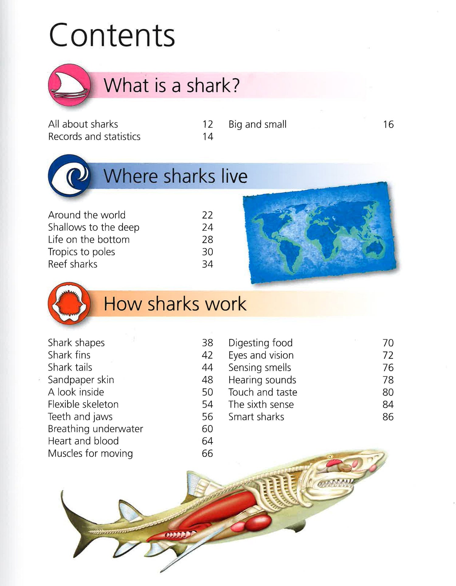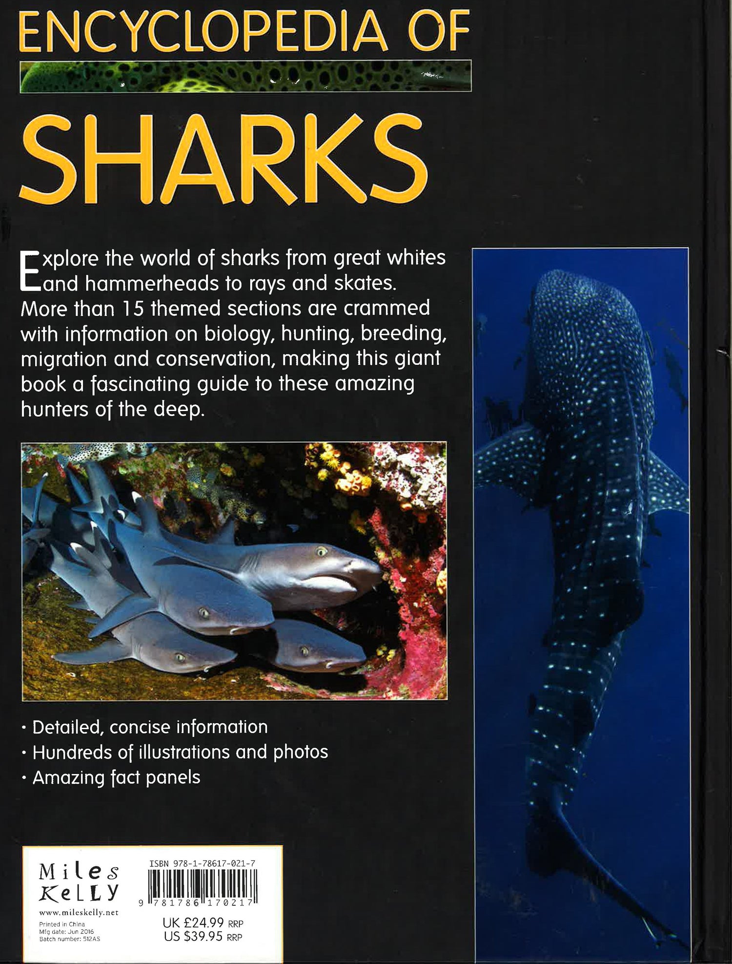 Encyclopedia of Sharks is a giant encyclopedia offering a comprehensive insight into the world of sharks for children ged 8+. Divided into clear sections, the book begins by exploring what sharks are and where they live, and progresses to how sharks work and life in the water. Shark species are then covered in great detail, revealing how great whites hunt their prey and why basking sharks cruise with their mouths wide open. This leads on to relatives of sharks, such as rays and sawfish. The book concludes by looking at sharks and people, including tourist attractions, why sharks are in trouble, and what we can do to save them. A useful source of information for school projects or homework.