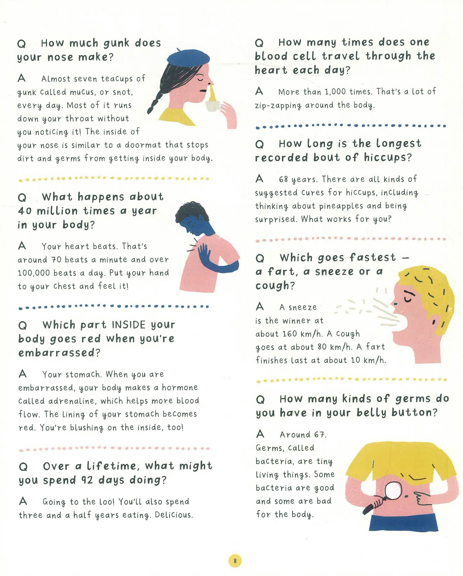 The dazzling facts are accompanied by bright, whimsical illustrations and the questions are organized into 10 chapters: Human Body, Science and Technology, Animals, Natural World, Space, Mindbending Stuff, History, Customs and Culture, Our World, and Arts and Entertainment.