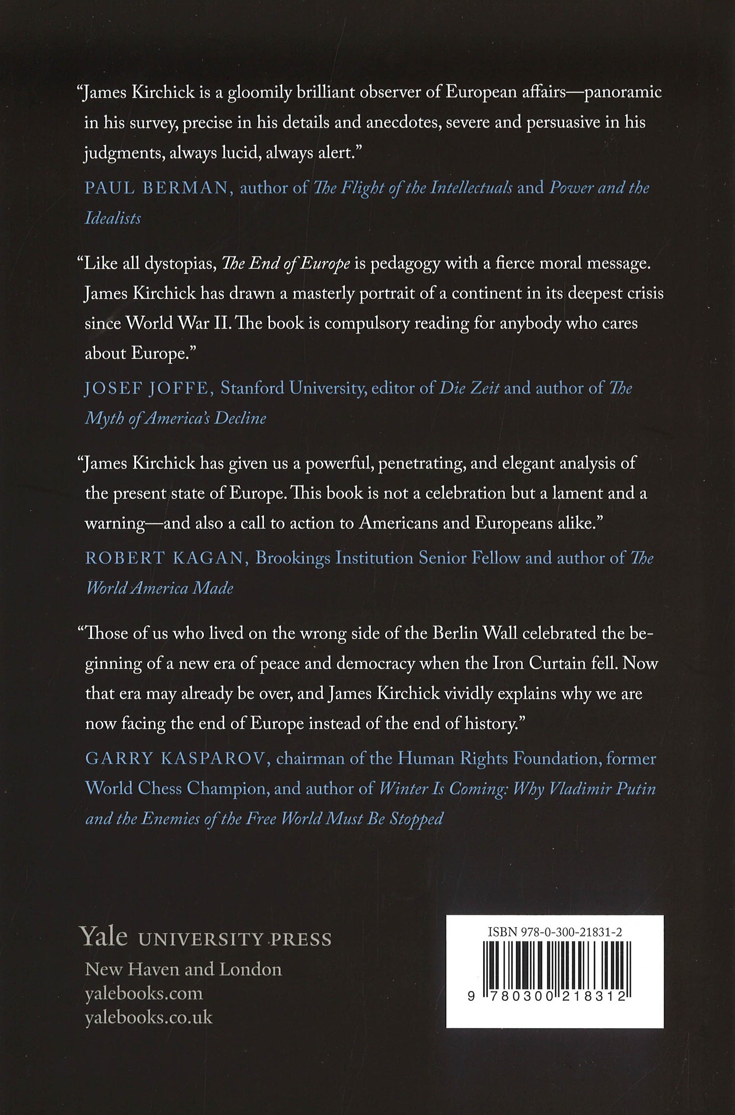 The disintegration of Europe's post-Cold War consensus in the face of anti-Semitism, populist nationalism, and territorial aggressionOnce the world's bastion of liberal, democratic values, Europe is now having to confront demons it thought it had laid to rest. The old pathologies of anti-Semitism, populist nationalism, and territorial aggression are threatening to tear the European postwar consensus apart. In riveting dispatches from this unfolding tragedy, James Kirchick shows us the shallow disingenuousness of the leaders who pushed for "Brexit;" examines how a vast migrant wave is exacerbating tensions between Europeans and their Muslim minorities; explores the rising anti-Semitism that causes Jewish schools and synagogues in France and Germany to resemble armed bunkers; and describes how Russian imperial ambitions are destabilizing nations from Estonia to Ukraine. With President Trump now threatening to abandon America's traditional role as upholder of the liberal world order and guarantor of the continent's security, Europe may be alone in dealing with these unprecedented challenges.