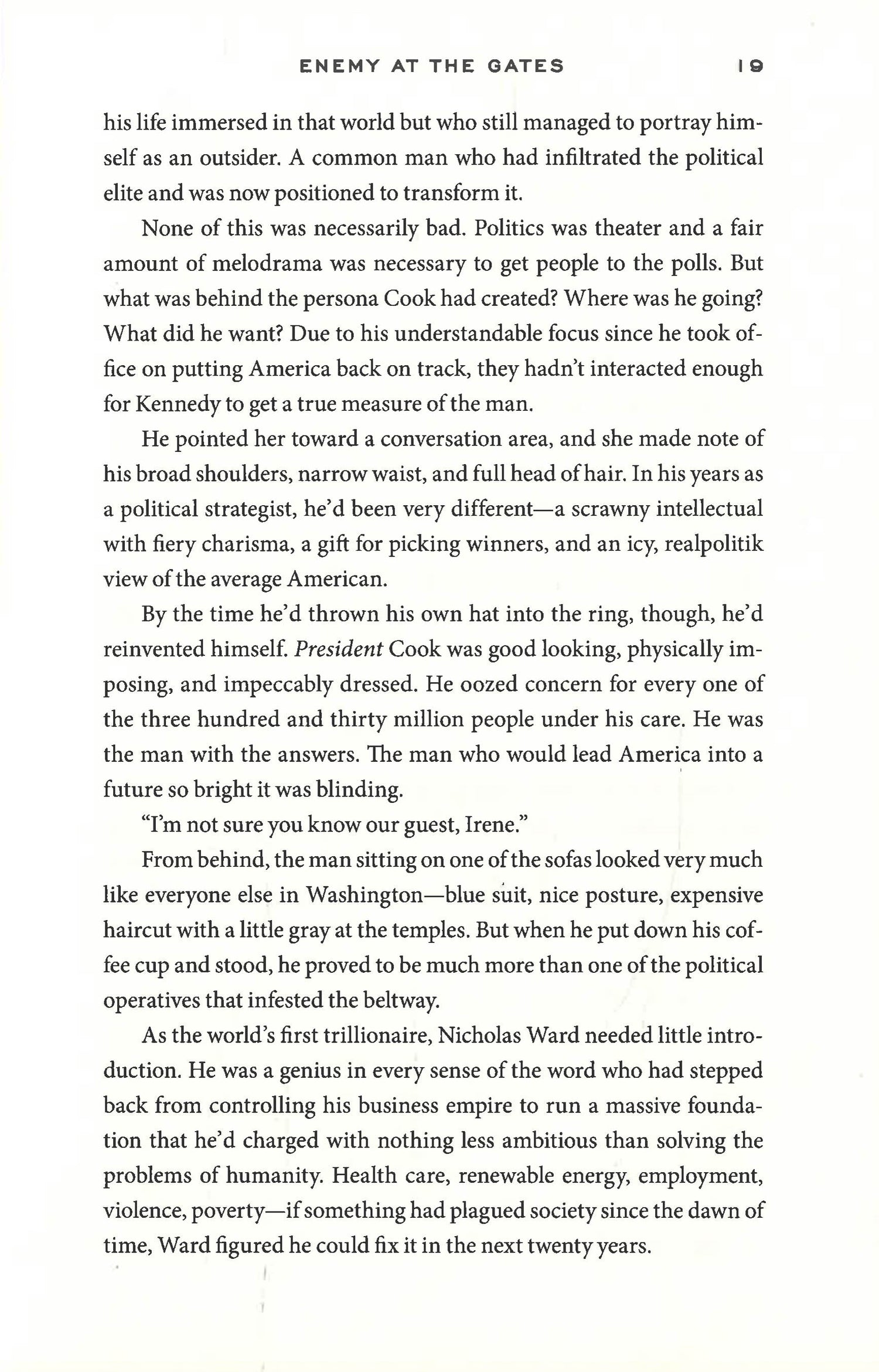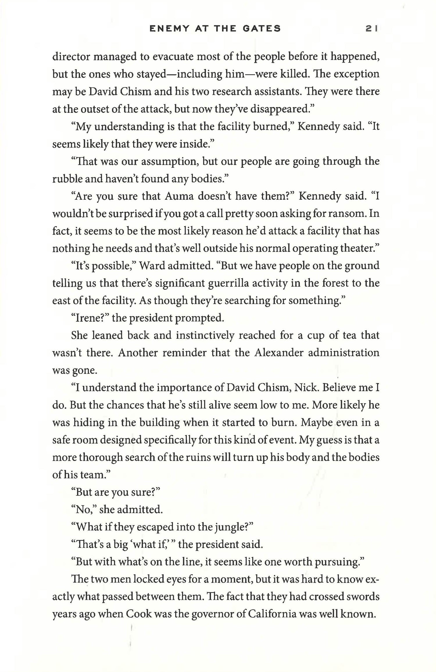 Mitch Rapp has worked for several presidents over his career, but Anthony Cook is unlike any he’s encountered before. Cunning and autocratic, he feels no loyalty to America’s institutions and is distrustful of the influence Rapp and CIA director Irene Kennedy have in Washington.
