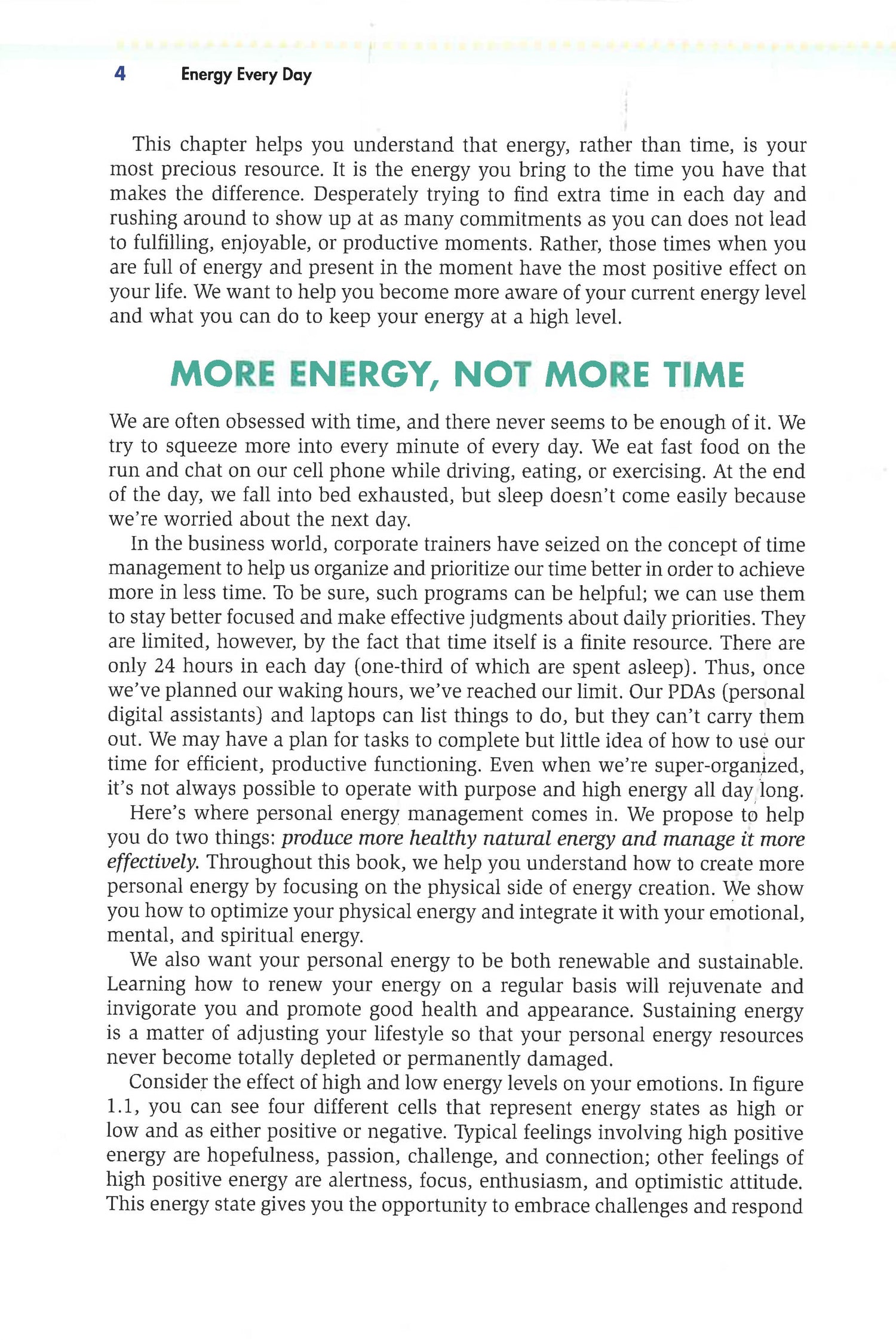 There's a worldwide energy crisis that has nothing to do with fossil fuels or nuclear and solar power. It's a crisis of personal energy. But this is one trend they don't have to accept. In fact, the solution is in their hands. This book shows how to incorporate physical activity into a daily routine for better health and increased energy. There's a worldwide energy crisis that has nothing to do with fossil fuels or nuclear and solar power. It's a crisis of personal energy. You're working longer hours, sleeping less, and spending less time being active. But this is one trend you don't have to accept. In fact, the solution is in your hands. Energy Every Day is the result of Human Performance Institute's decades of research into the lifestyles of the world's busiest people. Whether you're a student or CEO, athlete or small-business owner, you'll learn how to incorporate physical activity into your daily routine for better health and increased energy. In Energy Every Day, you'll create a personal energy plan specific to you-your goals, your needs, your schedule. Evaluate your lifestyle, identify opportunities, and add energy-boosting activities to your day. With this step-by-step program, you'll learn the following skills:-Increase personal energy and engagement with family and friends by incorporating physical activity into your daily schedule.-Adjust eating habits to sustain high energy throughout the day.-Establish a personal sleep schedule that addresses your brain and body's needs for rest and recovery.-Recognize and eliminate the daily pitfalls that drain energy and create mental and physical fatigue.With Energy Every Day, you can solve your own personal energy crisis. Be more alert, focused, and attentive and reap the rewards of an active and fit lifestyle. Energy Every Day is the energy plan for everybody.