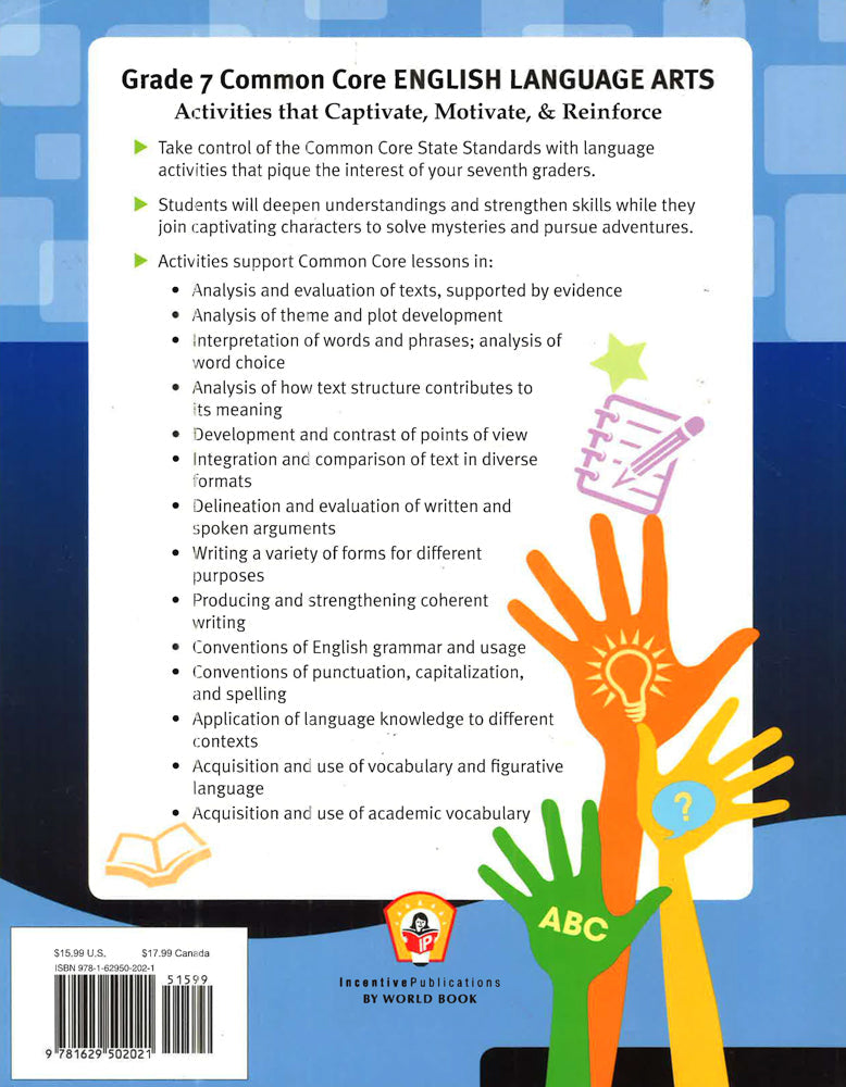 Full of engaging puzzles, stories, and adventures, this collection of motivating and fun activities is specifically aligned with seventh grade Common Core English Language Arts and Literacy State Standards and is perfect for reinforcing specific skills and ideal for differentiated instruction in a classroom with varying skill levels. The activities, which cover a range of reading levels and text complexity, each correlate to specific standards and include topics such as key ideas, details, craft and structure, and integration of knowledge and ideas. Reading, writing, speaking, and listening skills are also incorporated into the lessons throughout the book, which include assessments to measure a student’s strengths and weaknesses in each major skill area. This comprehensive set of activities is an invaluable resource for the busy educator teaching to the Common Core State Standards.