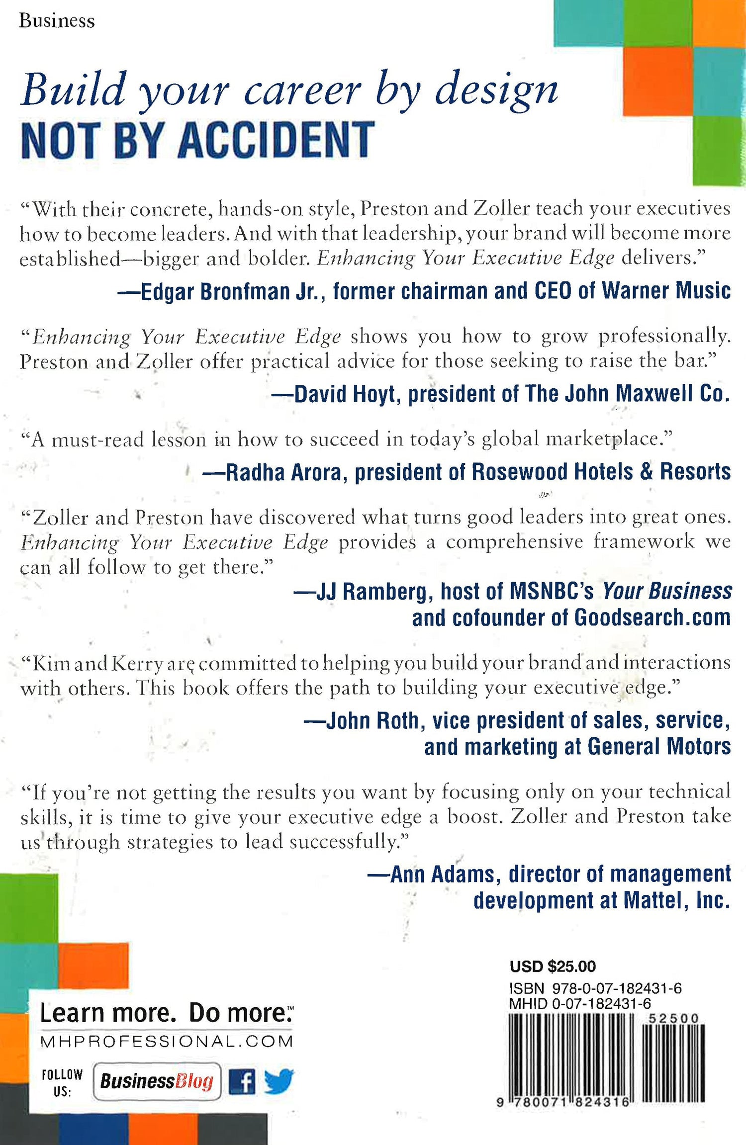 Build your career by design not by accidentWhy do some people get to the top while others-who work just as hard-don't get past middle management? Two words: Executive Edge.Your technical skills may get you the job, but your interpersonal skills and emotional intelligence will get you the promotion. In Enhancing Your Executive Edge, Kim Zoller and Kerry Preston provide the specific tools you need to make the jump from middle or upper management to an executive-level position. It's not about being among the standouts in a company. It's about being the standout.Zoller and Preston emphasize the importance of self-awareness in relationships with colleagues, clients, and executives-including first impressions, body language, and strategic communication. Enhancing Your Executive Edge will help you hone the following:Self-Management and Social AwarenessPersonal BrandingCommunication and PresenceBusiness ProtocolMotivation, Perseverance, and ExcellenceCompetence, passion, and hard work open doors. But when you're going for the very top spot, the competition increases exponentially-so you need to differentiate yourself. This book is designed to help you develop that special quality few people possess.Set yourself apart and offer value where the competition doesn't by enhancing your executive edge.Praise for Enhancing Your Executive Edge"With their concrete, hands-on style, Preston and Zoller teach your executives how to become leaders. And with that leadership, your brand will become more established-bigger and bolder. Enhancing Your Executive Edge delivers."-Edgar Bronfman Jr., former chairman and CEO of Warner Music"Enhancing Your Executive Edge shows you how to grow professionally. Preston and Zoller offer practical advice for those seeking to raise the bar."-David Hoyt, president of The John Maxwell Co."A must-read lesson in how to succeed in today's global marketplace."-Radha Arora, president of Rosewood Hotels & Resorts"Zoller and Preston have discovered what turns good leaders into great ones. Enhancing Your Executive Edge provides a comprehensive framework we can all follow to get there."-JJ Ramberg, host of MSNBC's Your Business and cofounder of Goodsearch.com"Kim and Kerry are committed to helping you build your brand and interactions with others. This book offers the path to building your executive edge."-John Roth, vice president of sales, service, and marketing at General Motors"If you're not getting the results you want by focusing only on your technical skills, it is time to give your executive edge a boost. Zoller and Preston take us through strategies to lead successfully."-Ann Adams, director of management development at Mattel, Inc.