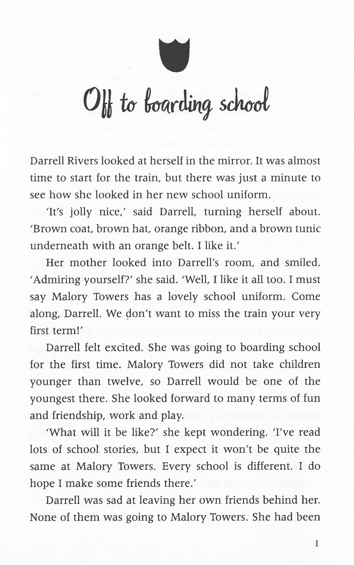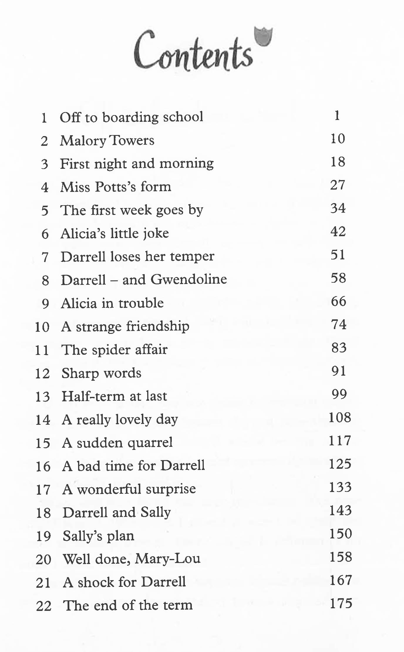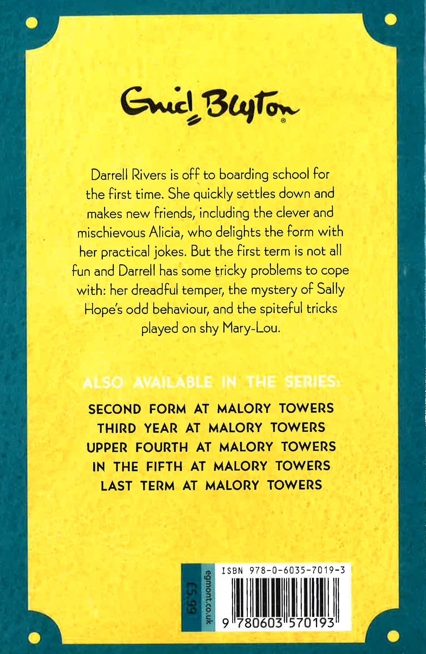 First Term at Malory Towers is the first Malory Towers book by Enid Blyton. In this book, we first meet the main characters including Darrell Rivers, Sally Hope, Mary-Lou, Alicia Johns, Betty Hill, Jean and teachers such as Miss Potts and Miss Grayling. The first book of 12 fictional tales of the adventures of school-girls at a Boarding school called Malory Towers. Written by Enid Blyton and later continued by Pamela Cox.