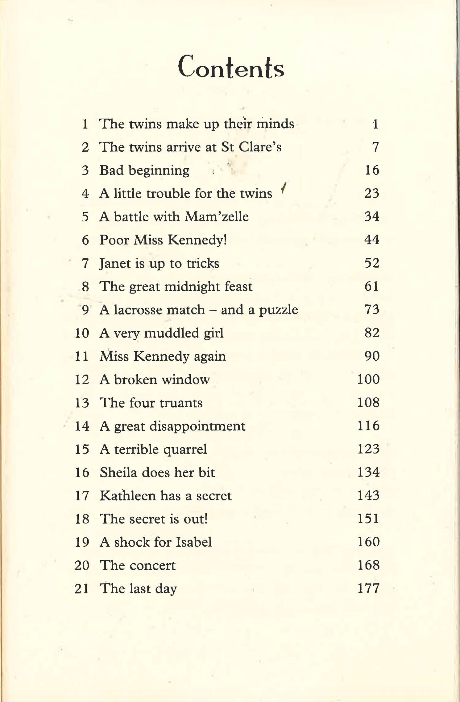 Schooldays at St Clare's are never dull fot twins. Pat and Isabel O'Sullivan and their friends. Snooty Pat and Isabel O'Sullivan are determined to give everyone at their new school a few surprises. But they are the ones who are in for a shock... (Age Range 9-12)