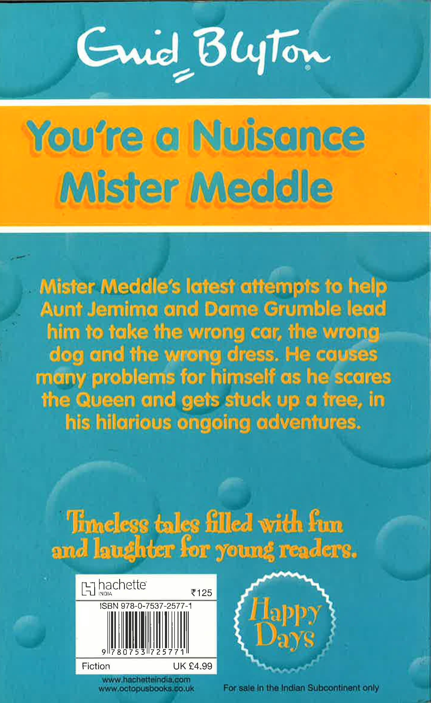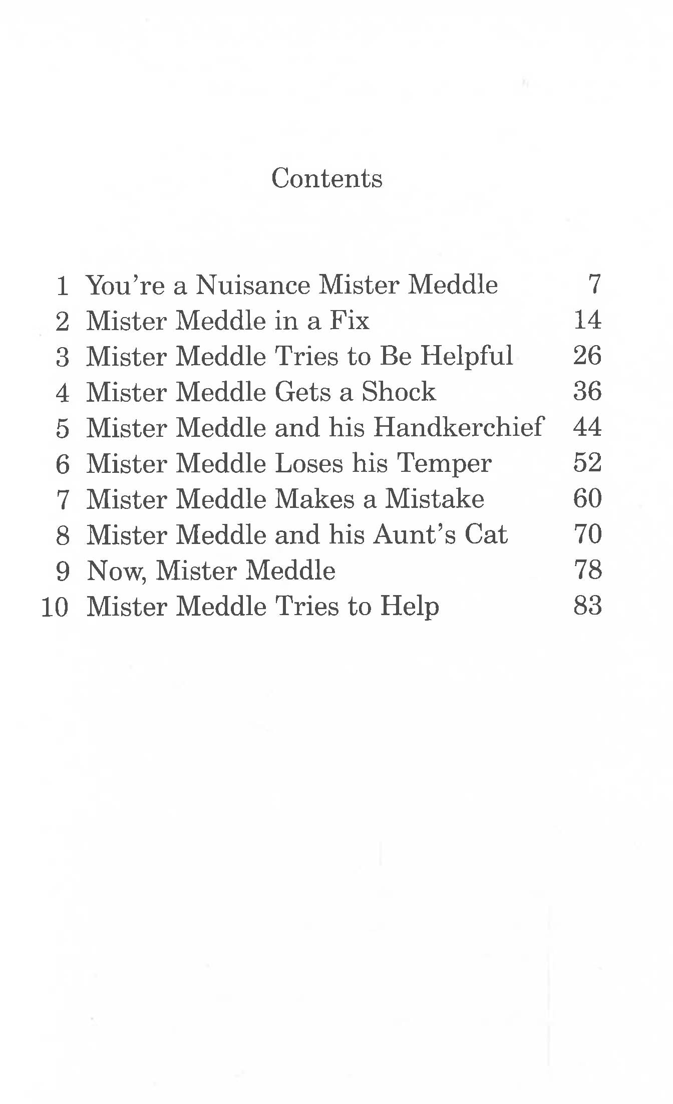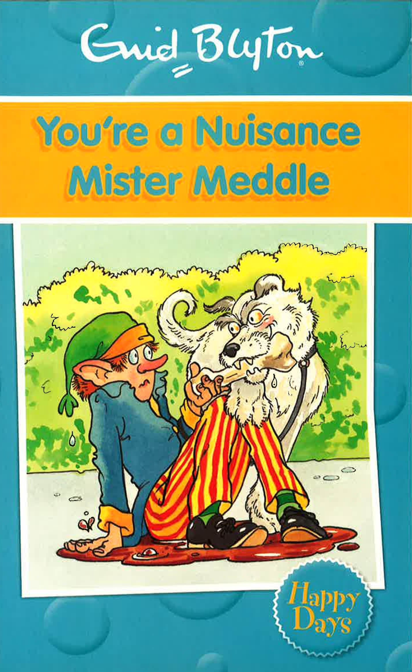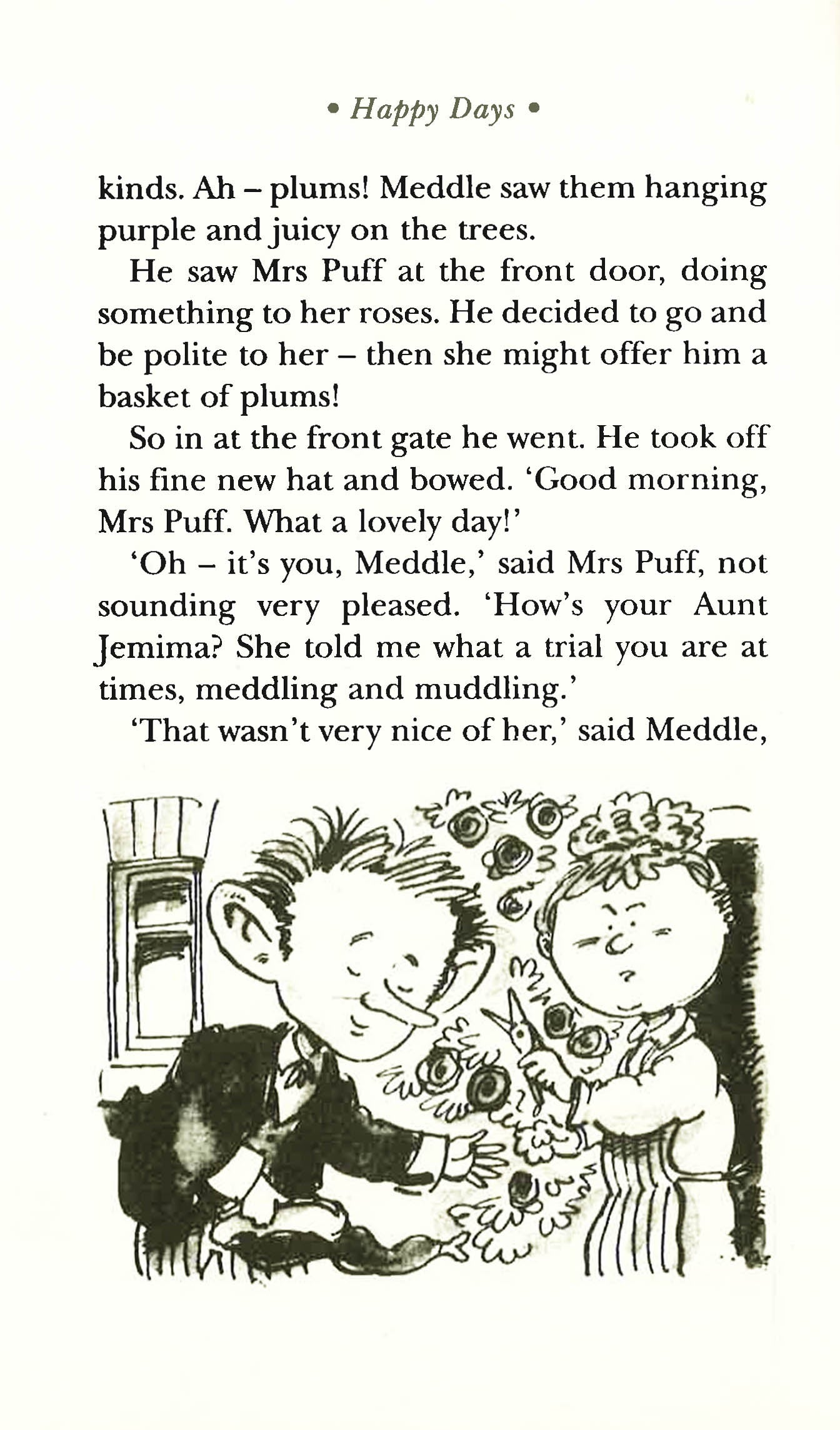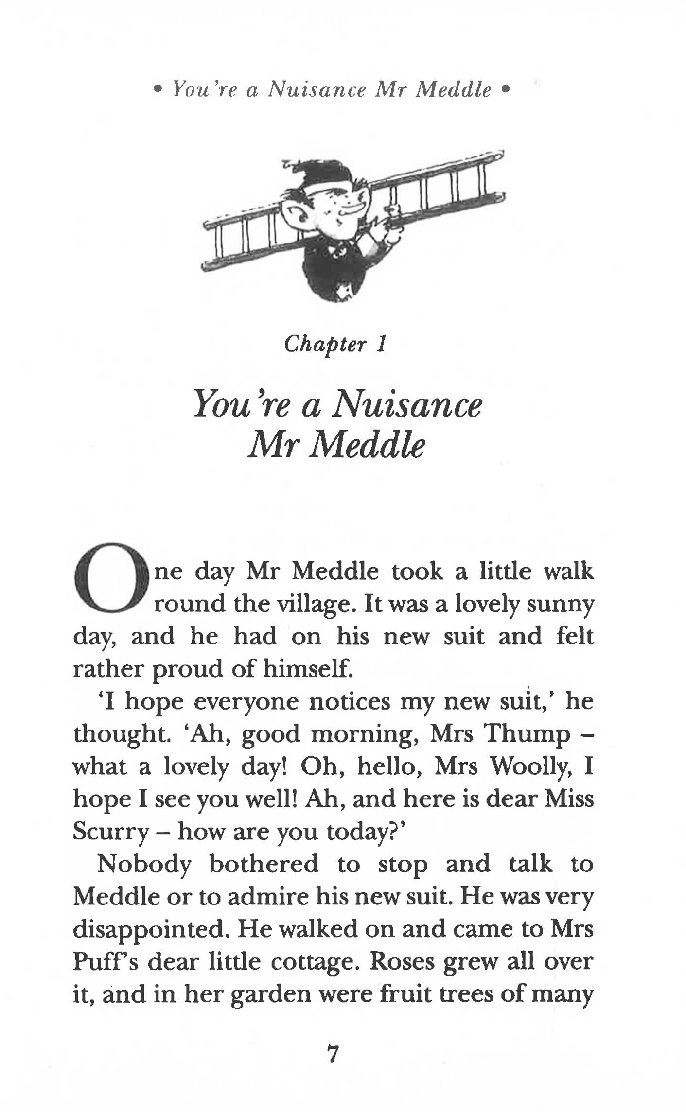 Mister Meddle is a pisie who is always willing to help out and do good deeds, but he never quite gets it right. He doesn't wait to be asked for help and always ends up in a muddle. This time he gets Mr Puff stranded in a plum tree, throws all his anut's luggage over a hedge and goes to bed in the wrong house.