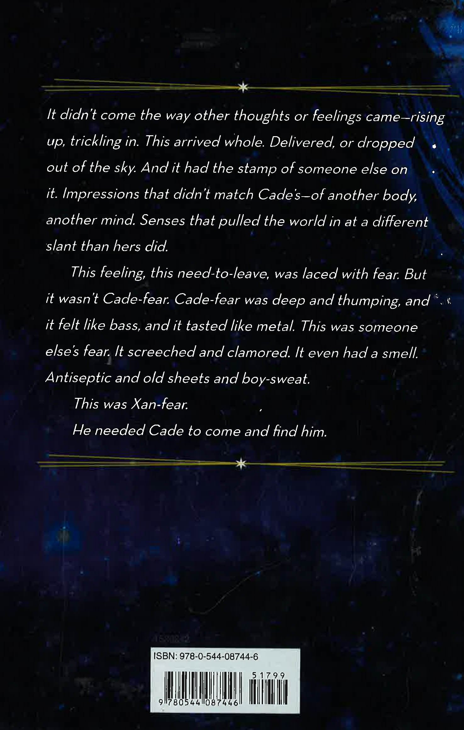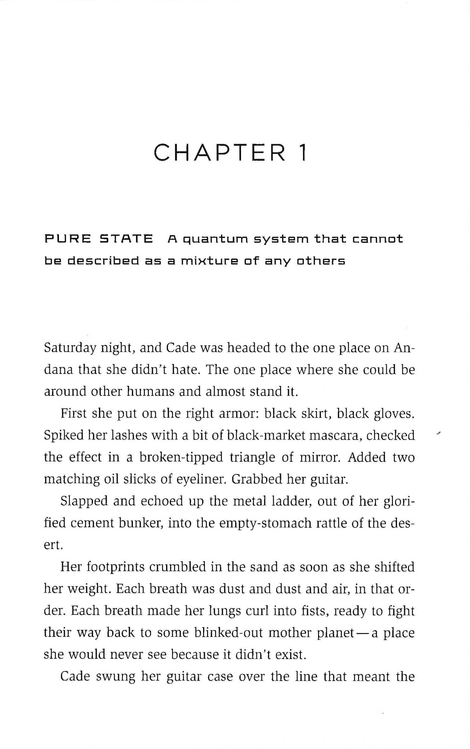 Alone was the note Cade knew best. It was the root of all her chords. Seventeen-year-old Cade is a fierce survivor, solo in the universe with her cherry-red guitar. Or so she thought. Her world shakes apart when a hologram named Mr. Niven tells her she was created in a lab in the year 3112, then entangled at a subatomic level with a boy named Xan. Cade's quest to locate Xan joins her with an array of outlaws - her first friends - on a galaxy-spanning adventure. And once Cade discovers the wild joy of real connection, there's no turning back.