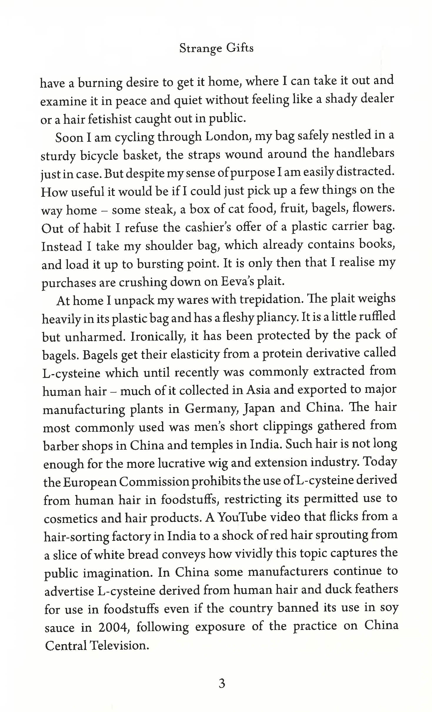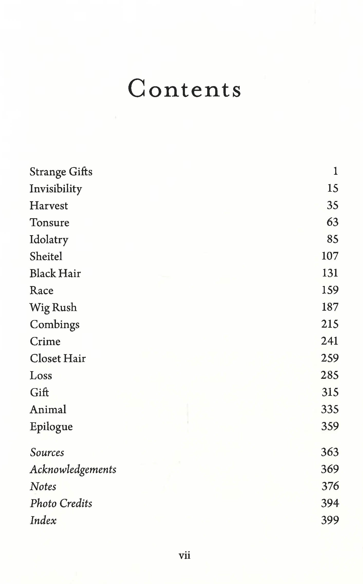 When it's not attached to your head, your very own hair takes on a disconcerting quality. Suddenly, it is strange. And yet hair finds its way into all manner of unexpected places, far from our heads, including cosmetics, clothes, ropes, personal and public collections, and even food. Whether treated as waste or as gift, relic, sacred offering or product in a billion-dollar industry for wigs and hair extensions, hair has many stories to tell.