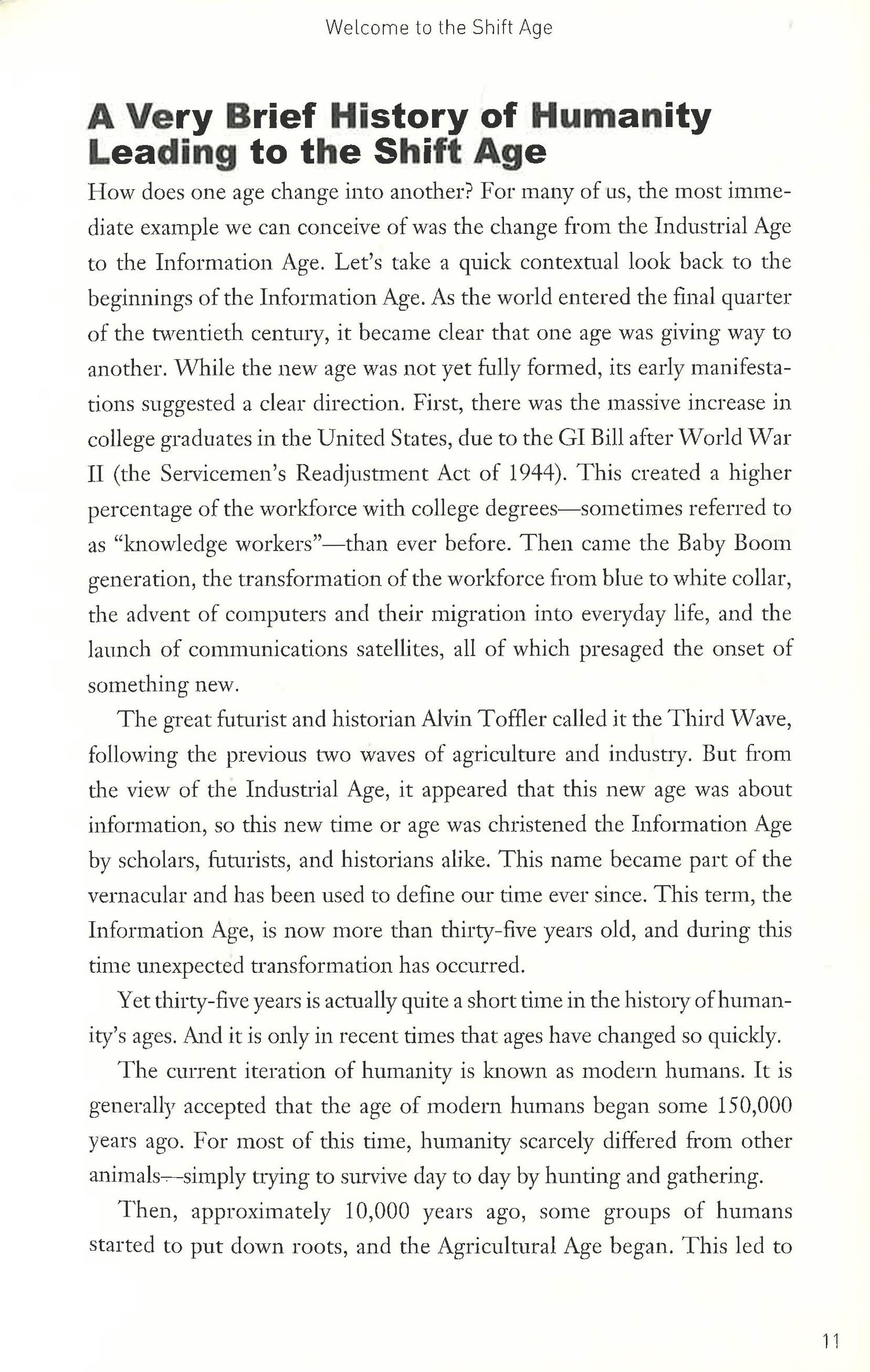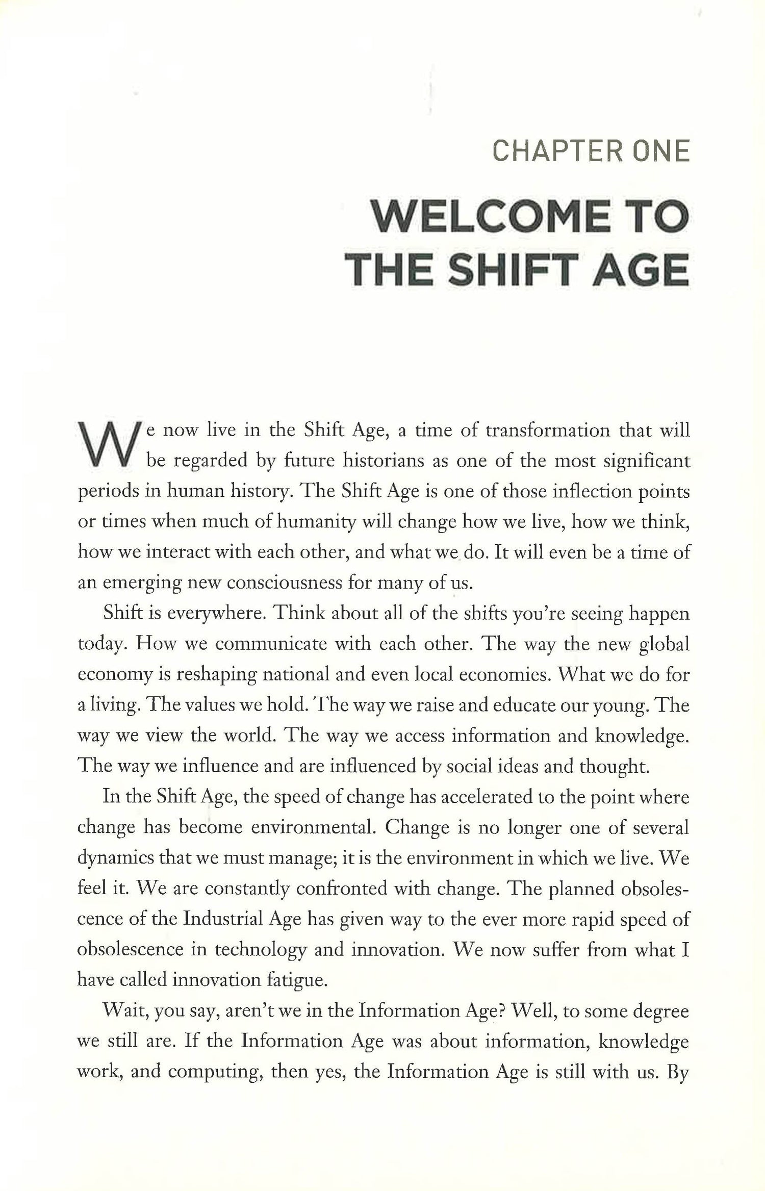 We are leaving the 'Information Age' and transitioning into the 'Shift Age' claims David Houle, who sets forth his vision of the risks & opportunities thus presented. The 'Shift Age', he argues, means a world fully global yet focused on the individual, where the speed of change is so fast that change itself is the new norm.
