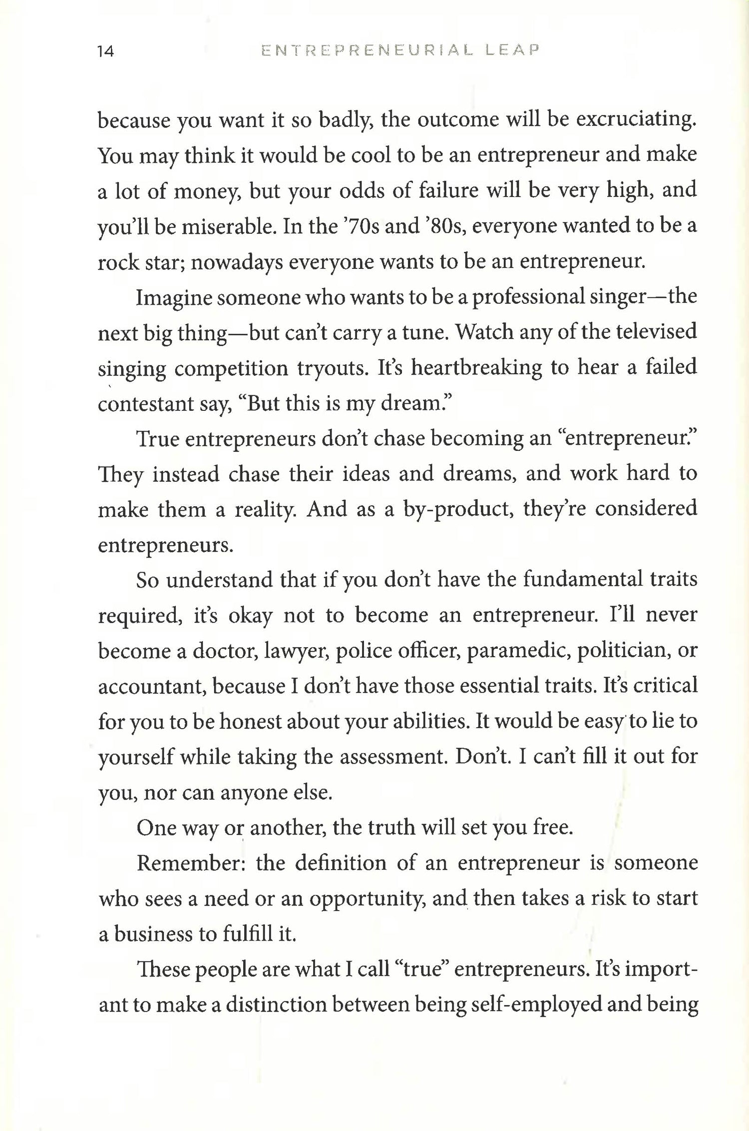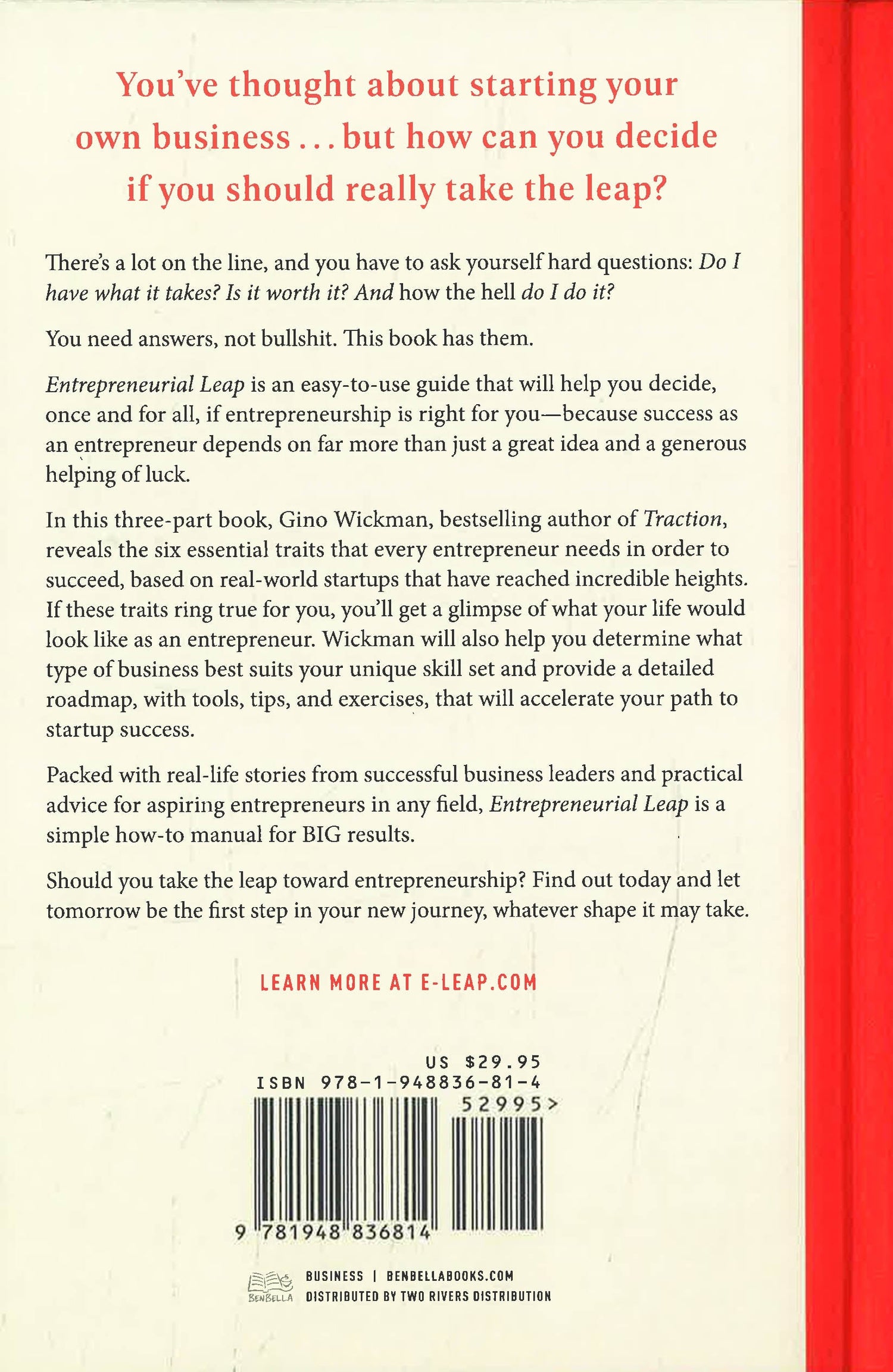 You've thought about starting your own business . . . but how can you decide if you should really take the leap? There's a lot on the line, and you have to ask yourself difficult questions: Do I have what it takes? Is it worth it? And how the hell do I do it? You need answers, not bullshit. This book has them. Entrepreneurial Leap: Do You Have What it Takes to Become an Entrepreneur? is an easy-to-use guide that will help you decide, once and for all, if entrepreneurship is right for you-because success as an entrepreneur depends on far more than just a great idea and a generous helping of luck. In this three-part book, Gino Wickman, bestselling author of Traction, reveals the six essential traits that every entrepreneur needs in order to succeed, based on real-world startups that have reached incredible heights. If these traits ring true for you, you'll get a glimpse of what your life would look like as an entrepreneur. What's more, Wickman will help you determine what type of business best suits your unique skill set and provide a detailed roadmap, with tools, tips, and exercises, that will accelerate your path to startup success.
