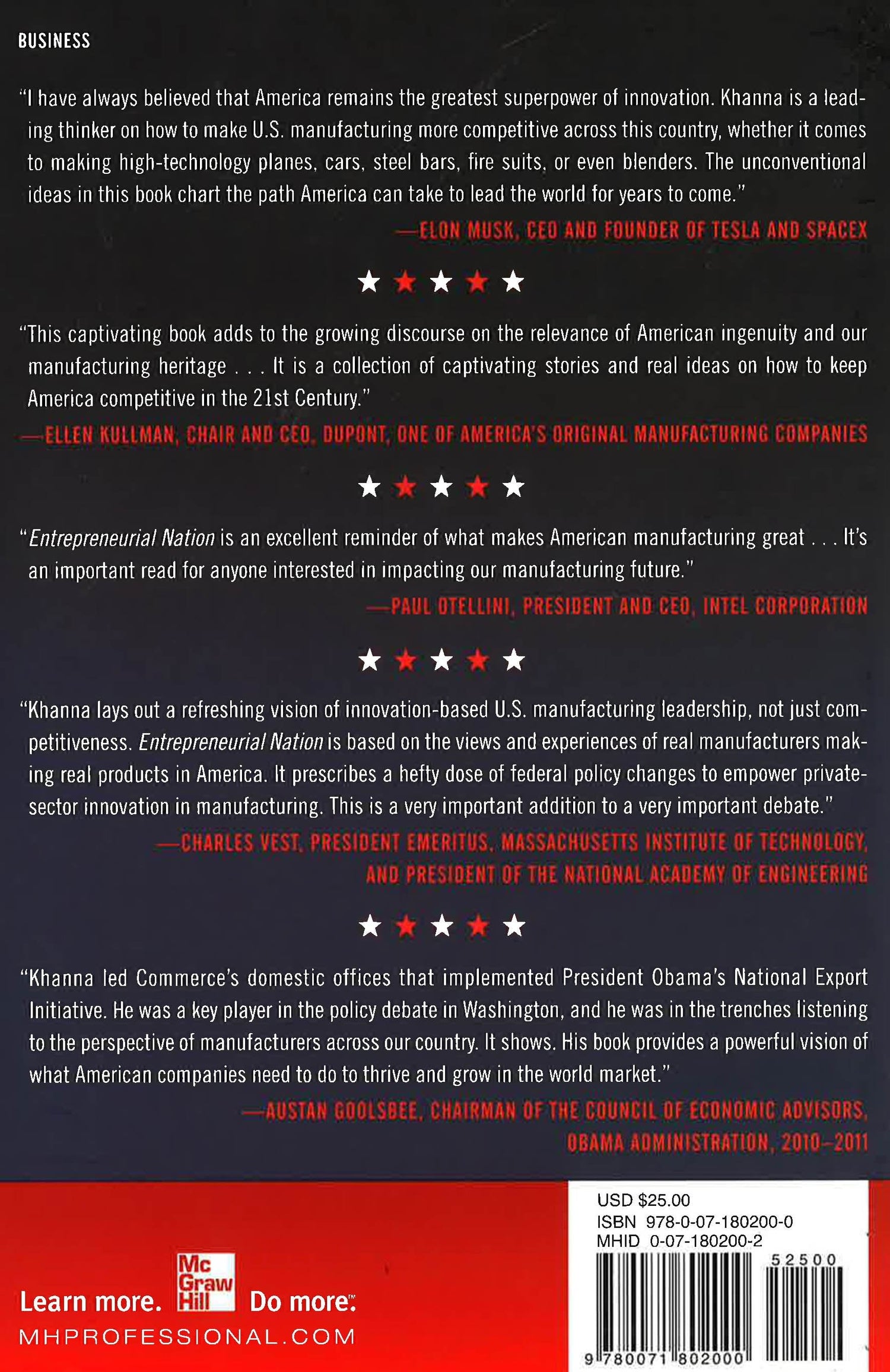 A call to arms for everyone who believes in America's future. If you trust what you hear in the news, America is in trouble. We've moved our manufacturing overseas. We've lost our competitive edge to China, Germany, Japan, and Brazil. We've entered our final days as an economic leader. Don't believe it! This provocative book from a former deputy assistant secretary of commerce will explode the myths you've been fed by the media and reinforce your faith in American ingenuity. Author Ro Khanna takes you inside Washington's economic think tanks and onto the front lines of the most innovative companies in the nation. You'll discover: How small and large businesses are spurring innovation and growthWhy the accepted wisdom about American manufacturing is wrongHow America can stay ahead of lower-cost factories in China and BrazilWhy manufacturing is so important to our national security and futureHow to keep the best jobs, companies, and opportunities here in America. Despite everything you've heard about the economy,one fact remains: America continues to be a world leader in manufacturing. Some of the world's best products are still being made here. The world's greatest innovations are still being developed by Apple, Google, and countless others. This book will prove to you that smart companies are staying ahead of the curve--and you can, too. You'll learn how a fourth-generation business, the Globe Manufacturing Company, customized its firefighting suits to beat foreign competitors. You'll discover how Vitamix worked with clients like Starbucks to produce a superior coffee blender. And you'll hear behind-the-scenes stories from theAmerican steel industry, aerospace companies, the defense technology sector, and other world-class leaders. You'll also learn why companies like Solyndra fail--and what lessons we can take from them. This is more than a book. It is a wake-up callthat will spark debate, shatter beliefs, and inspire action in every American who wants to succeed in the future. This is Entrepreneurial Nation.