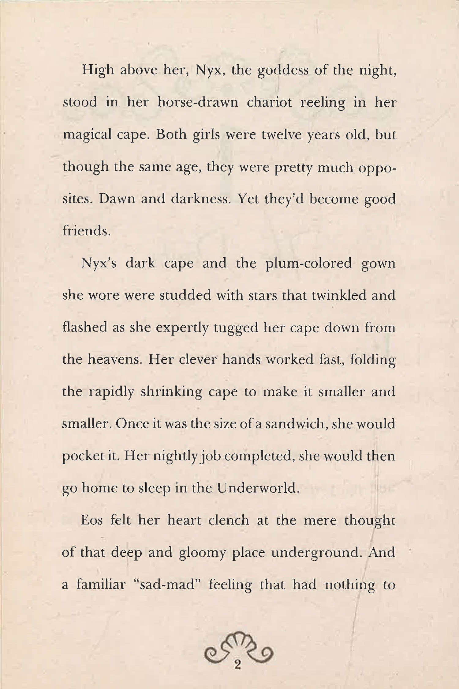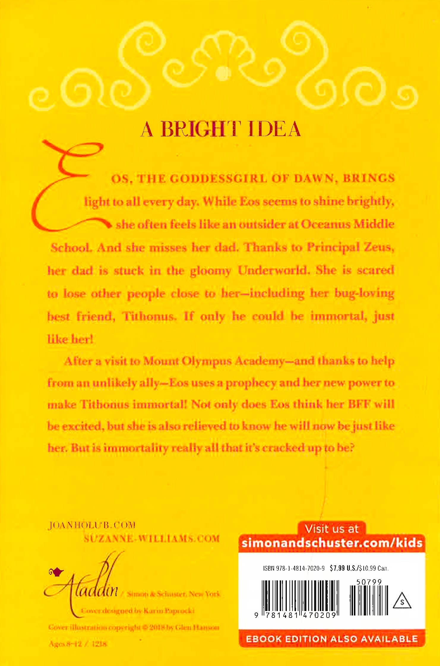 Feeling like an outsider at Oceanus Middle School and missing her dad, Eos, the goddess girl of dawn, uses a prophecy and her new power to make her best friend Tithonus immortal.