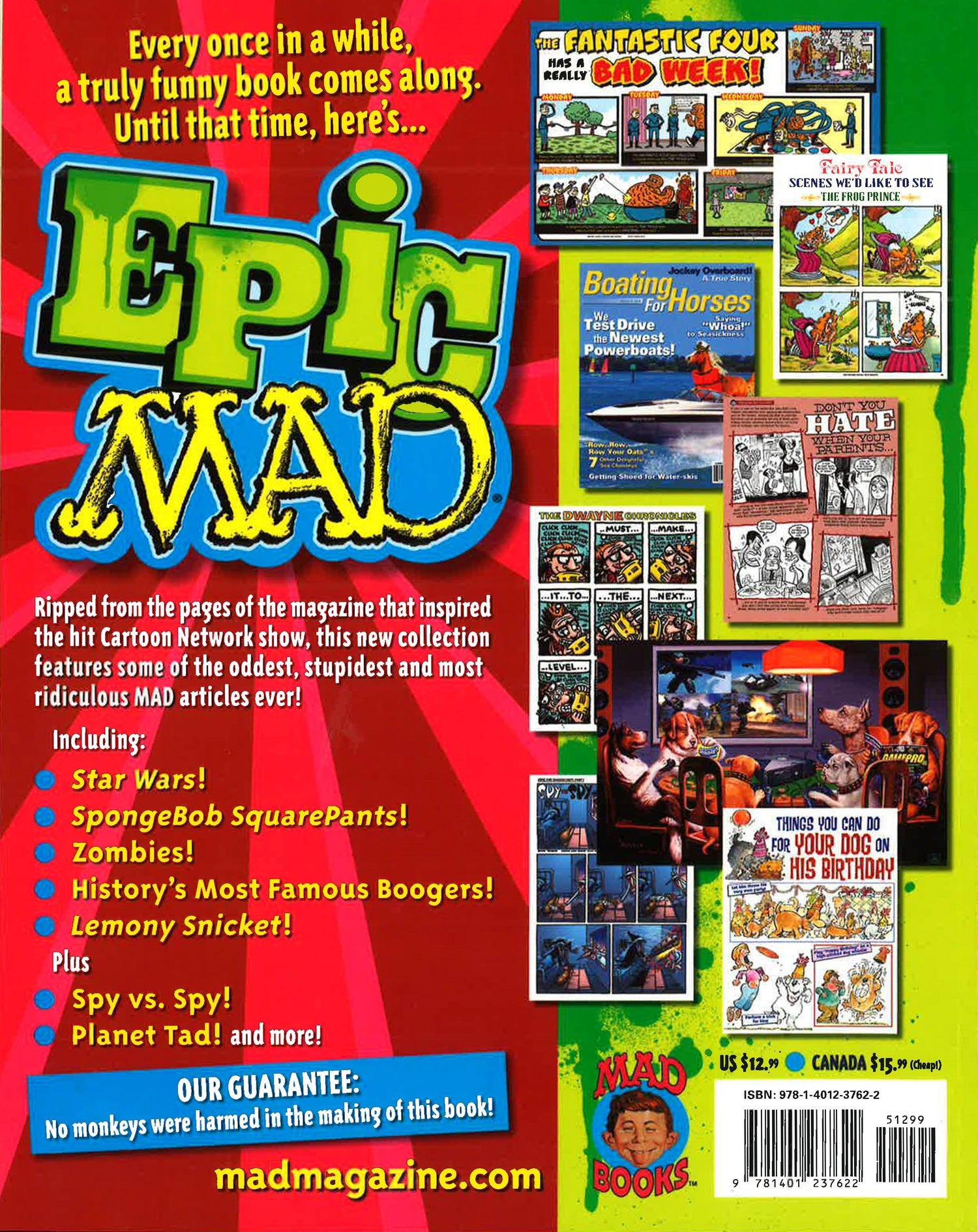 The Usual Gang of Idiots is at it again - and this time, they've come up with the new EPIC MAD TP! Ripped from the pages of the magazine that inspired the hit Cartoon Network show, this new collection features some of the oddest and most stupid and ridiculous MAD articles ever! Including are classic spoofs of: * Star Wars! * Sponge Bob Square Pants! * Zombies! * History's Most Famous Bloggers! * Lemony Snicket! Plus Spy vs. Spy, Planet Tad, and more!