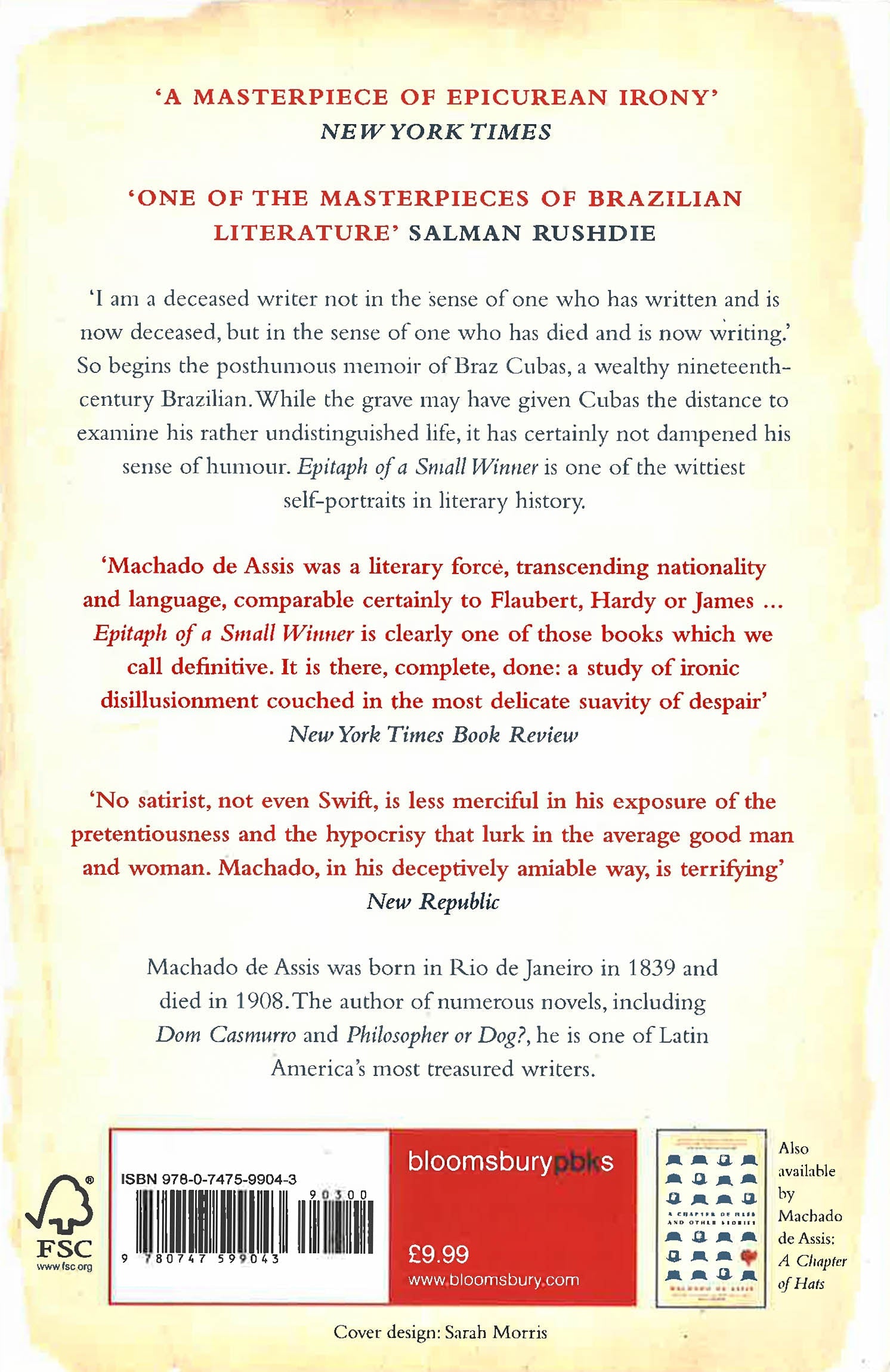 'I am a deceased writer not in the sense of one who has written and is now deceased, but in the sense of one who has died and is now writing'. So begins the posthumous memoir of Braz Cubas, a wealthy nineteenth-century Brazilian. While the grave may have given Cubas the distance to examine his rather undistinguished life, it has certainly not dampened his sense of humour. Epitaph of a Small Winner is one of the wittiest self-portraits in literary history.