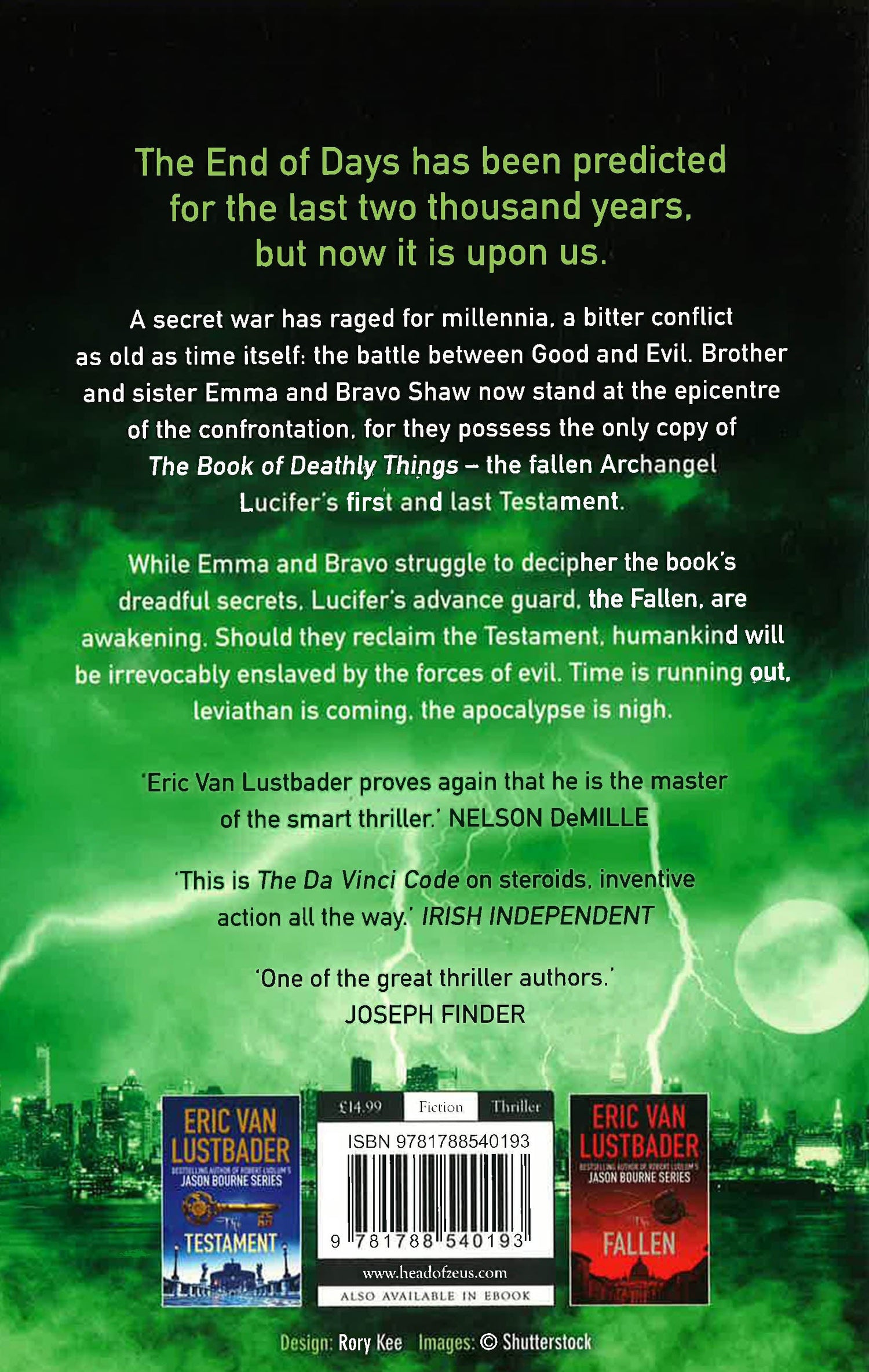 The End of Days has been predicted for the last two thousand years. But now, without warning, it is upon us. The latest instalment in the globe-spanning, action-packed Testament series. The End of Days has been predicted for the last two thousand years, but now it is upon us. A secret war was raged for millennia, a bitter conflict as old as time itself: the battle between Good and Evil. Brother and sister Emma and Bravo Shaw now stand at the epicentre of the confrontation, for they possess the only copy of The Book of Deathly Things - the fallen Archangel Lucifer's first and last Testament. While Emma and Bravo struggle to decipher the book's dreadful secrets, Lucifer's advance guard, the Fallen, are awakening. Should they can reclaim the Testament, Humankind will be irrevocably enslaved by the forces of evil. Time is running out, leviathan is coming, the apocalypse is nigh.
