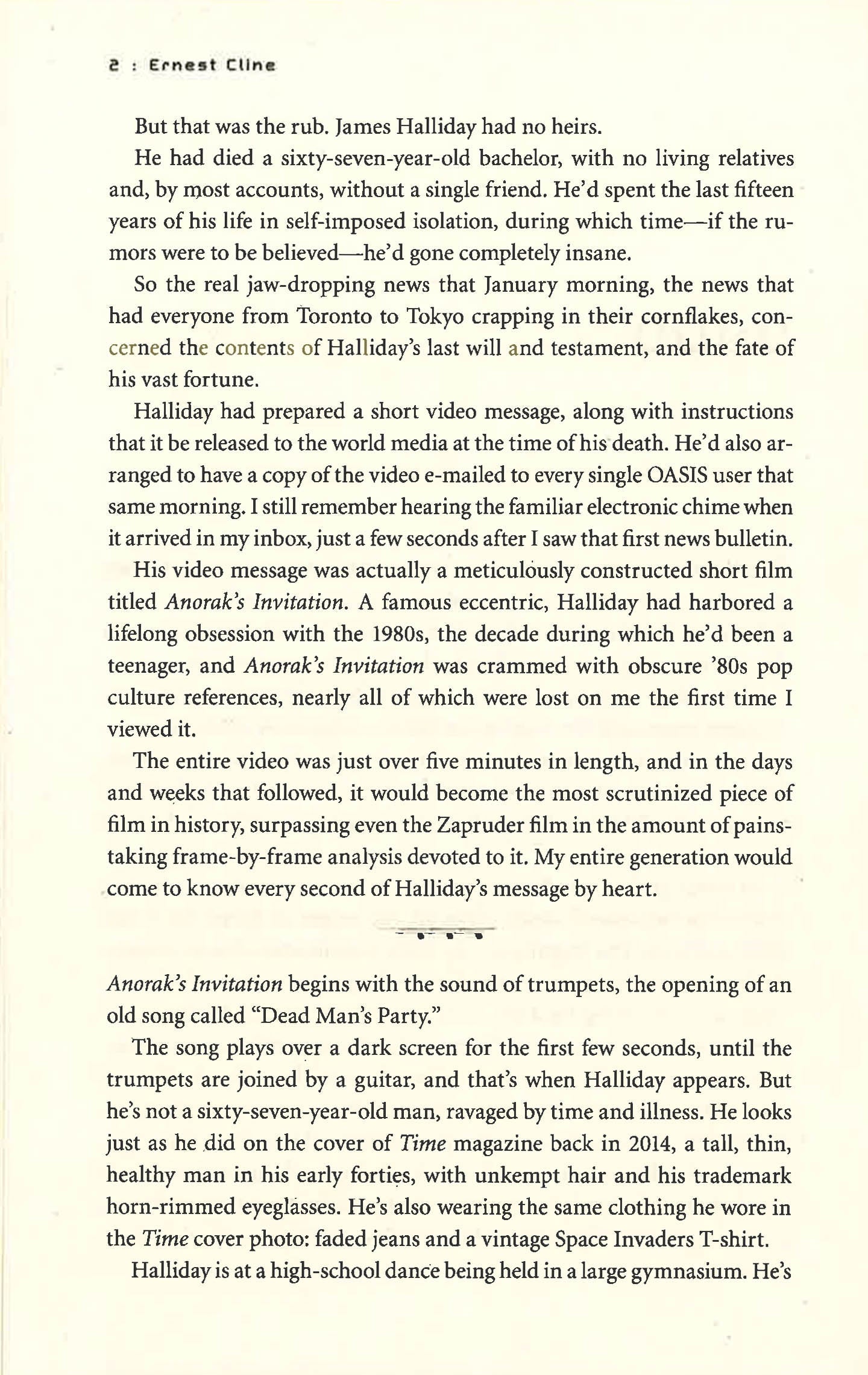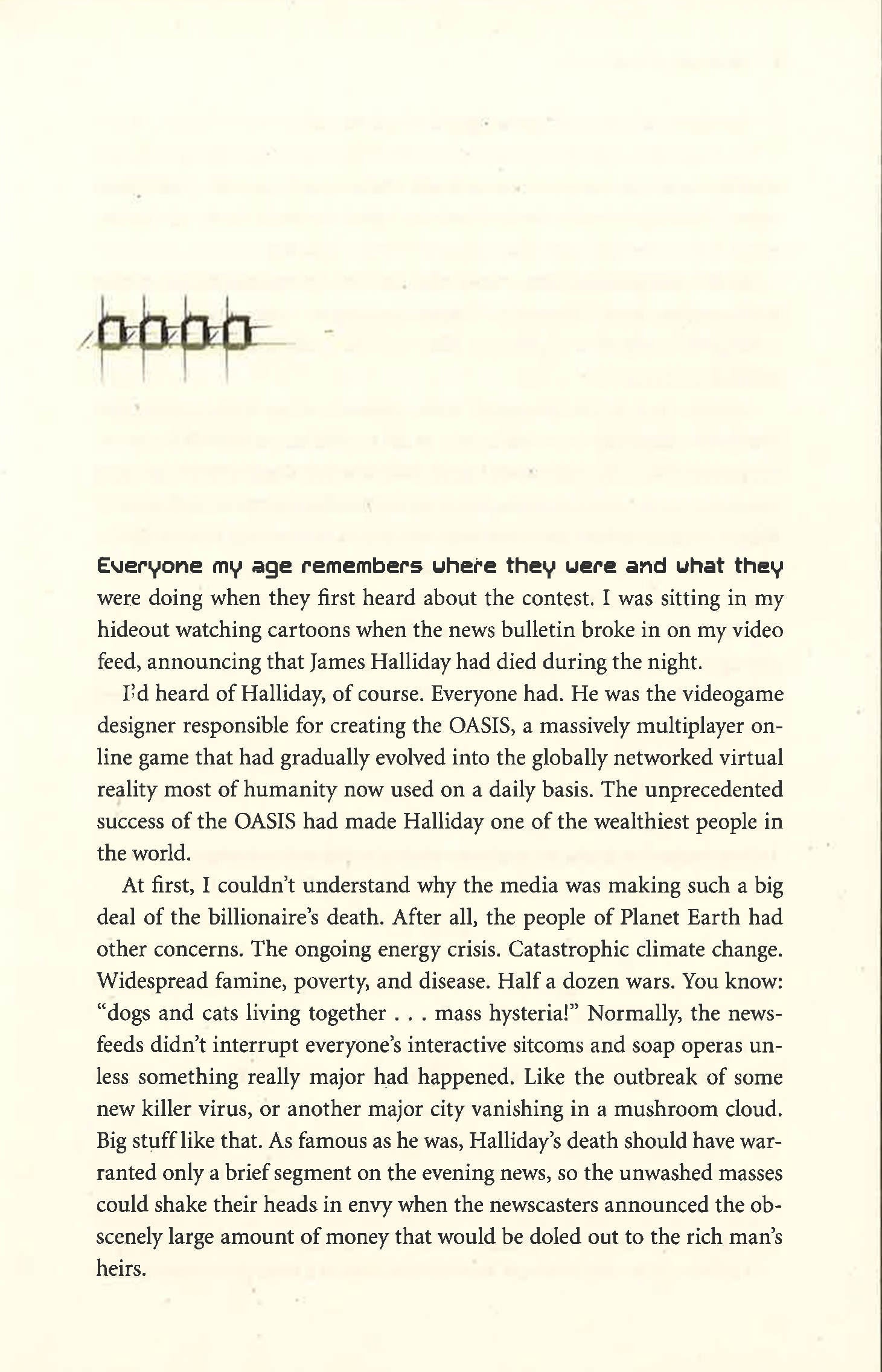 Famine, poverty, and disease are widespread. Like most of humanity, Wade Watts escapes this depressing reality by spending his waking hours jacked into the OASIS, a sprawling virtual utopia where you can be anything you want to be, where you can live and play and fall in love on any of ten thousand planets. PRE-ORDER NOW - READY PLAYER TWO: THE SEQUEL______________________***NOW A MAJOR MOTION PICTURE DIRECTED BY STEVEN SPIELBERG***A world at stake. A quest for the ultimate prize. Are you ready?It's the year 2044, and the real world has become an ugly place. We're out of oil. We've wrecked the climate. Famine, poverty, and disease are widespread. Like most of humanity, Wade Watts escapes this depressing reality by spending his waking hours jacked into the OASIS, a sprawling virtual utopia where you can be anything you want to be, where you can live and play and fall in love on any of ten thousand planets. And like most of humanity, Wade is obsessed by the ultimate lottery ticket that lies concealed within this alternate reality: OASIS founder James Halliday, who dies with no heir, has promised that control of the OASIS - and his massive fortune - will go to the person who can solve the riddles he has left scattered throughout his creation. For years, millions have struggled fruitlessly to attain this prize, knowing only that the riddles are based in the culture of the late twentieth century. And then Wade stumbles onto the key to the first puzzle.Suddenly, he finds himself pitted against thousands of competitors in a desperate race to claim the ultimate prize, a chase that soon takes on terrifying real-world dimensions - and that will leave both Wade and his world profoundly changed.____________________________________If you loved READY PLAYER ONE and can't wait for more, check out ARMADA, Ernest Cline's geek masterpiece!'Wildly original and stuffed with irresistible nostalgia, Ready Player One is a spectacularly genre-busting, ambitious, and charming debut' Independent'Part intergalactic scavenger hunt, part romance, and all heart' CNN 'Ernest Cline's novel deserves to be a modern classic' SciFiNow'Gorgeously geeky, superbly entertaining, this really is a spectacularly successful debut' Daily Mail