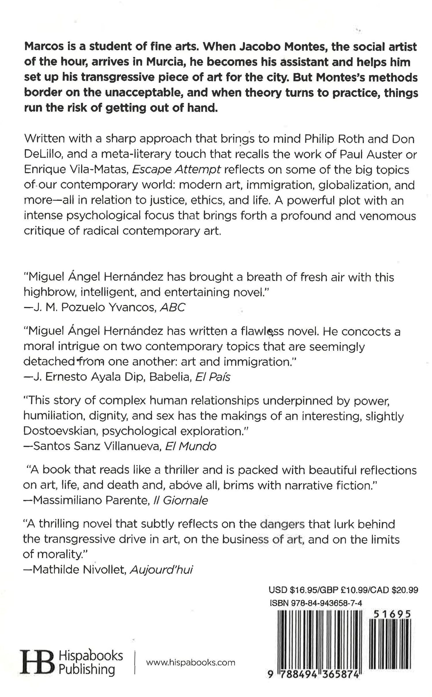 Marcos is a student of fine arts. When Jacobo Montes, the social artist of the hour, arrives in Murcia, he becomes his assistant and helps him set up his transgressive piece of art for the city. But Montes's methods border on the unacceptable, and when theory turns to practice, things run the risk of getting out of hand. Written with a sharp approach that brings to mind Philip Roth and Don DeLillo, and a meta-literary touch that recalls the work of Paul Auster or Enrique Vila-Matas, Escape Attempt reflects on some of the big topics of our contemporary world: modern art, immigration, globalization, and more--all in relation to justice, ethics, and life.A powerful plot with an intense psychological focus that brings forth a profound and venomous critique of radical contemporary art.