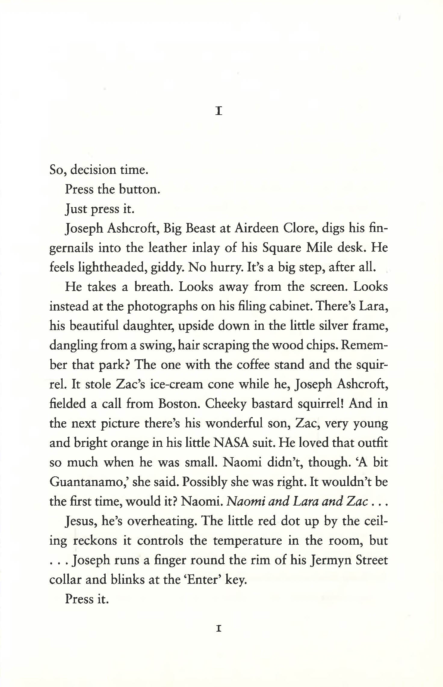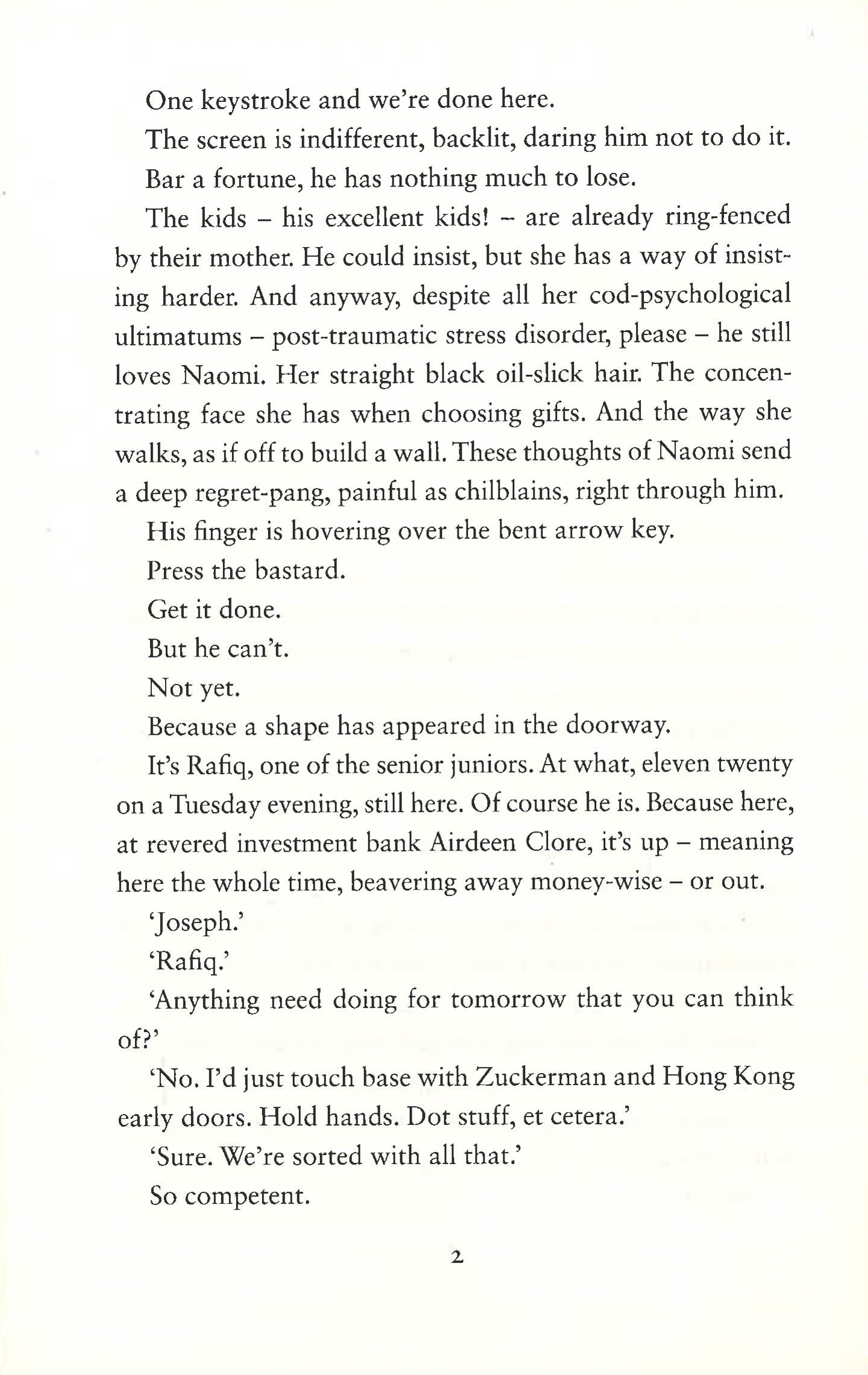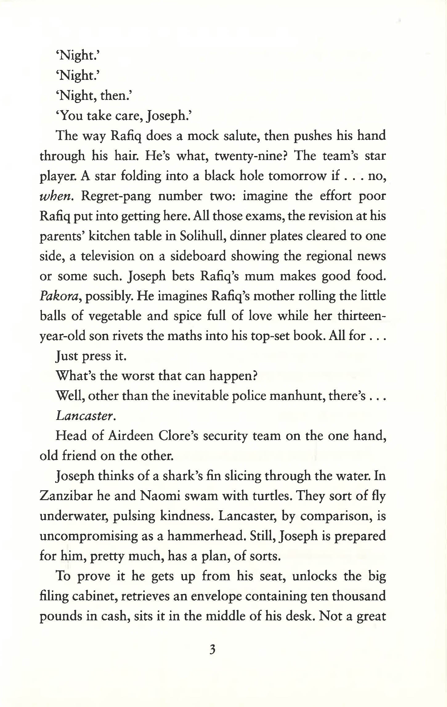 On Joseph's trail is Ben Lancaster, the bank's head of security and, as it happens, a former army friend with whom he shares a violent, guilt-ridden past.